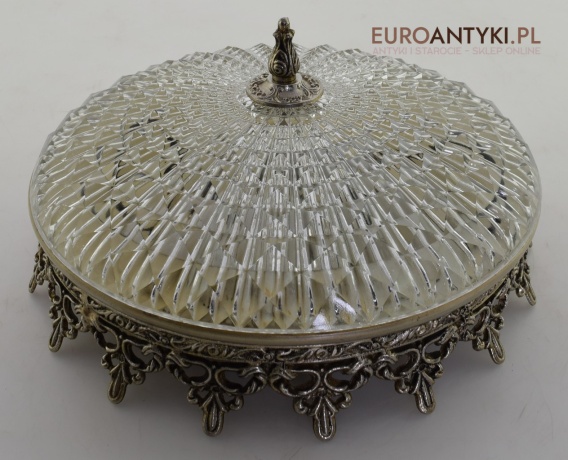 Sprowadzona z Austrii, pochodzi z połowy ubiegłego wieku. Wykonana z jakiegoś masywnego metalu o kolorze starego srebra. Klosz to kryształowe szkło.