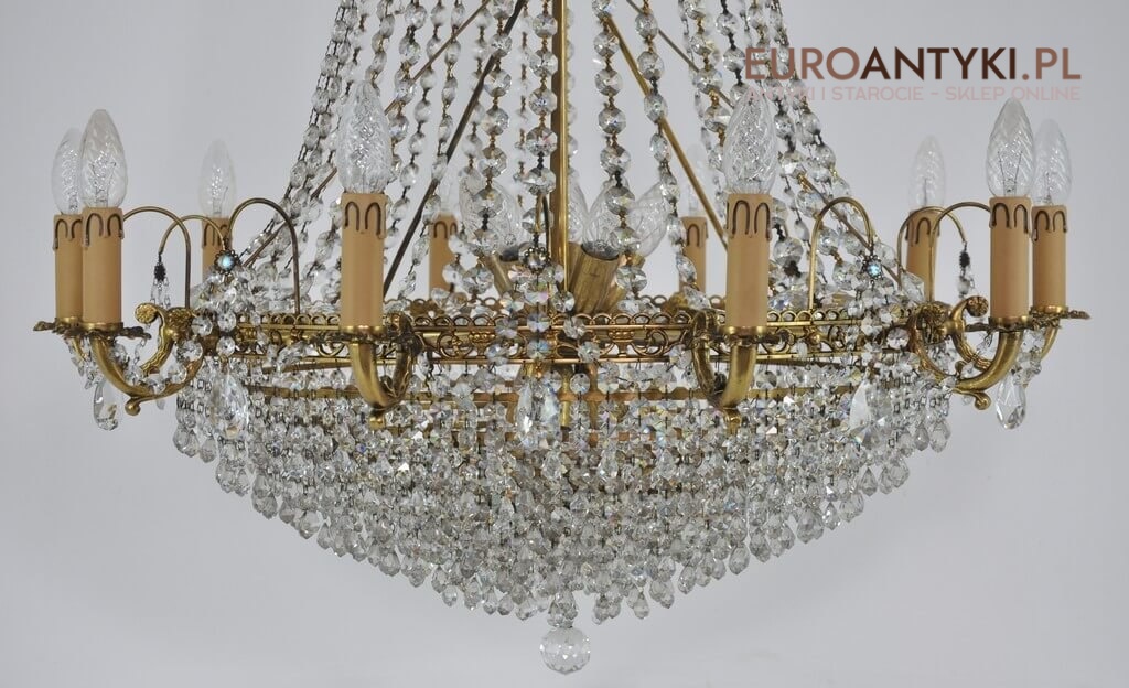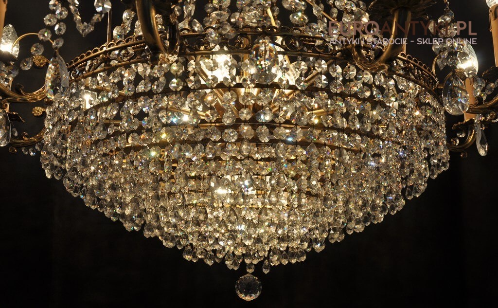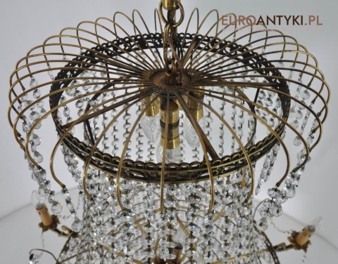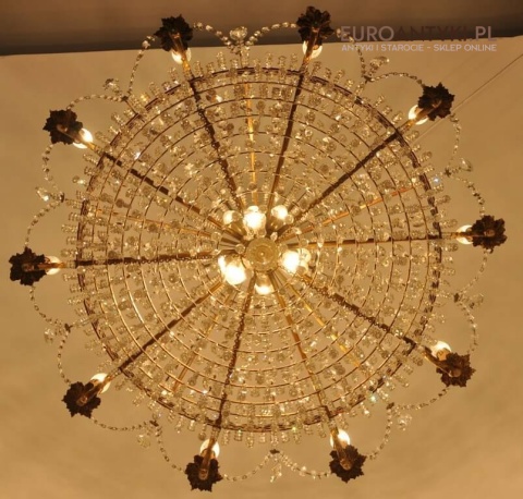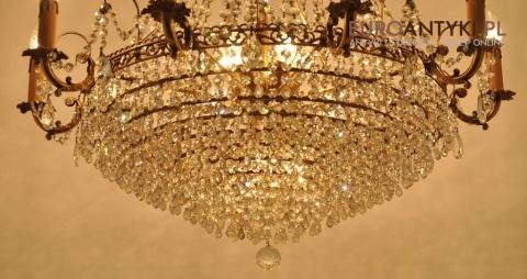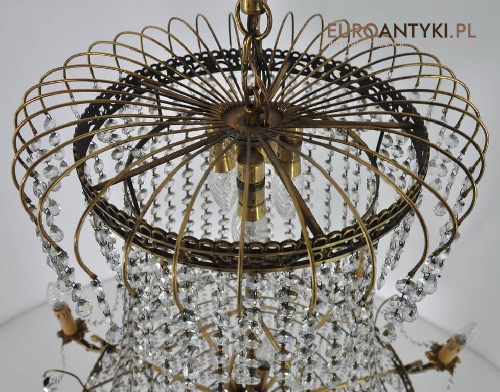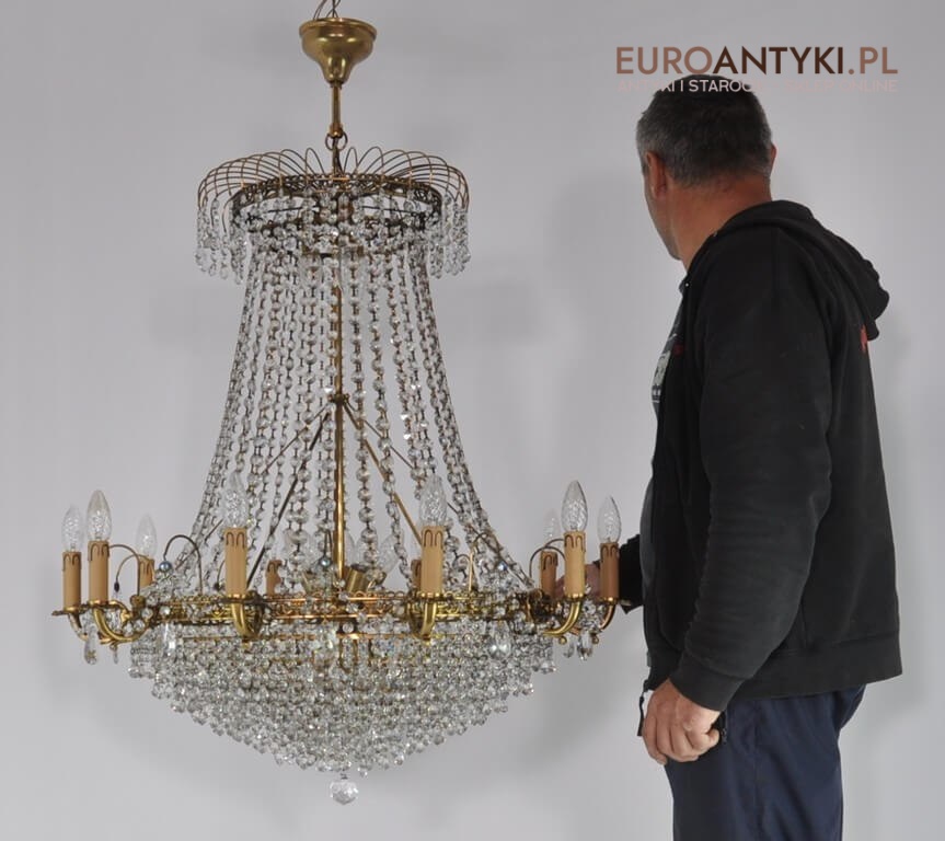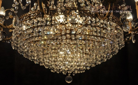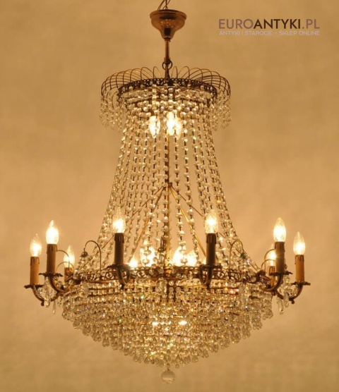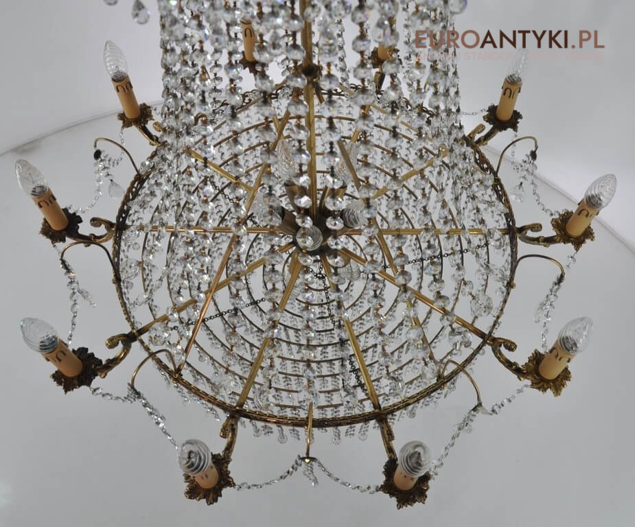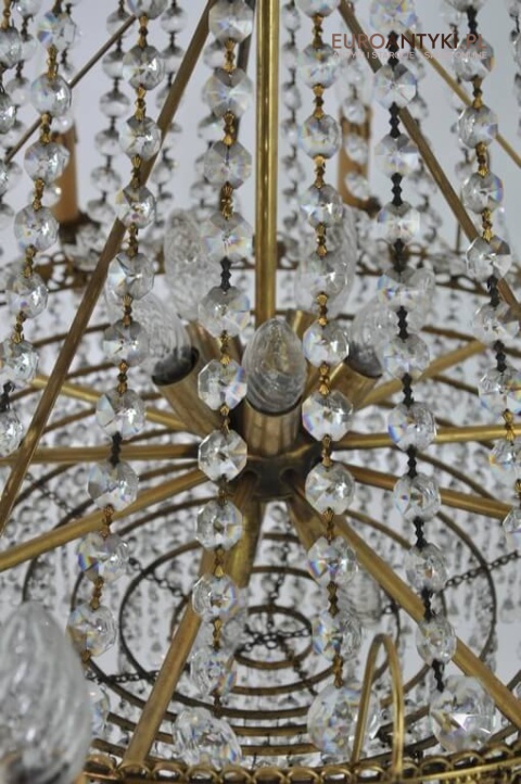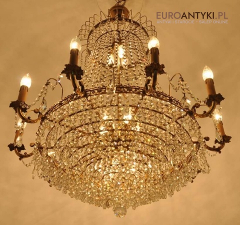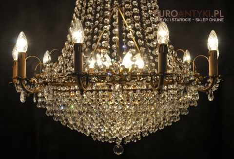 Niezwykle dekoracyjny pałacowy żyrandol wykonany z masywnego brązu i prawdziwych kryształowych zawieszek. KASKADA KRYSZTAŁÓW!!!