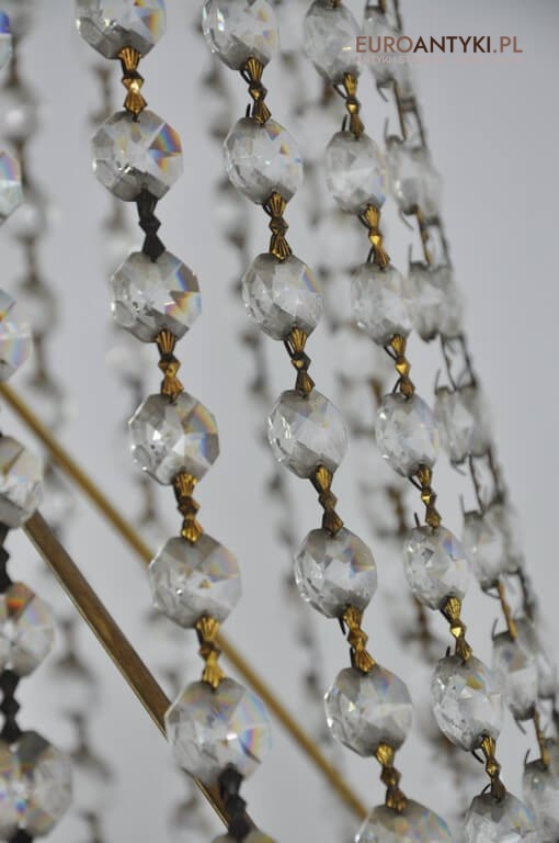 Niezwykle dekoracyjny, pałacowy żyrandol składający się z kaskadowo upiętych łańcuchów ośmiokątnych kryształków o różnych wielkościach.