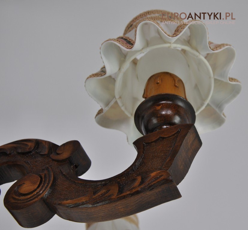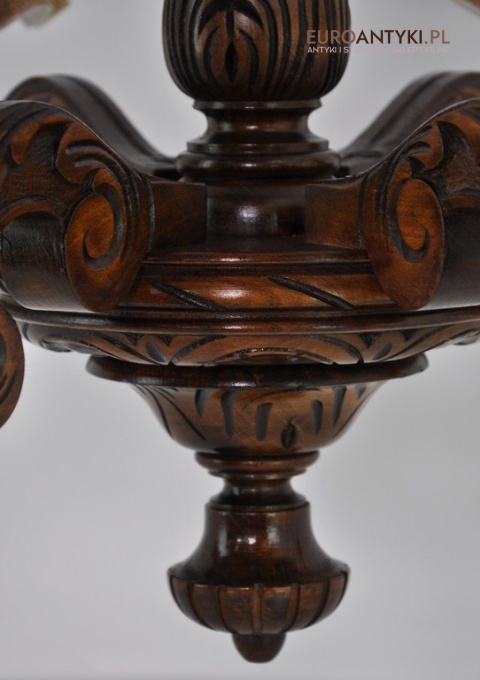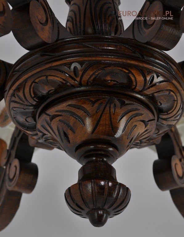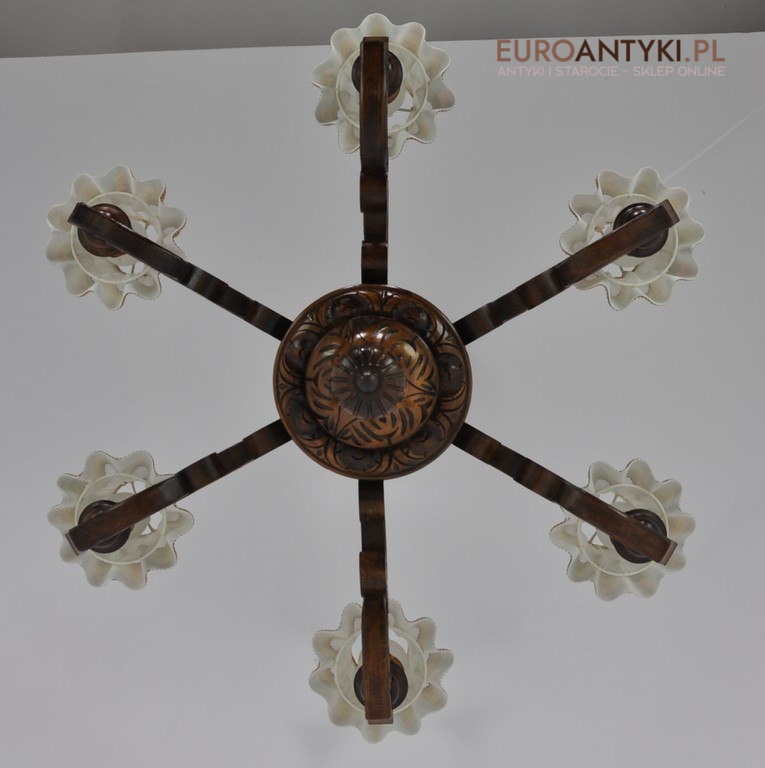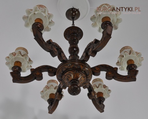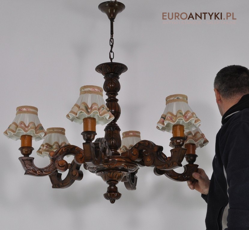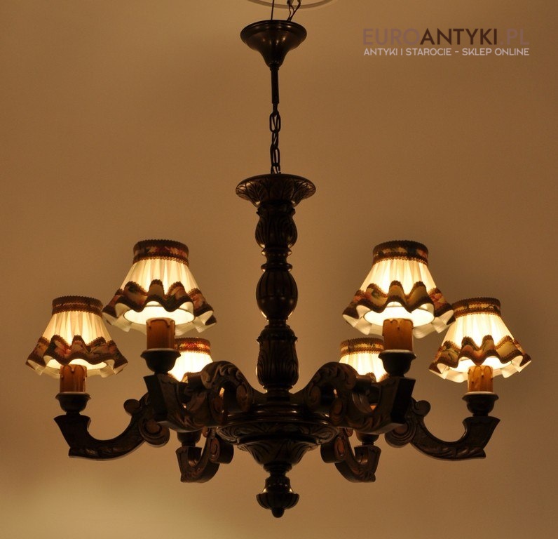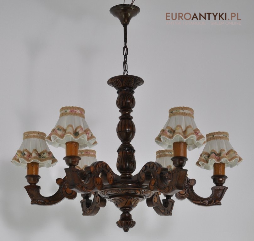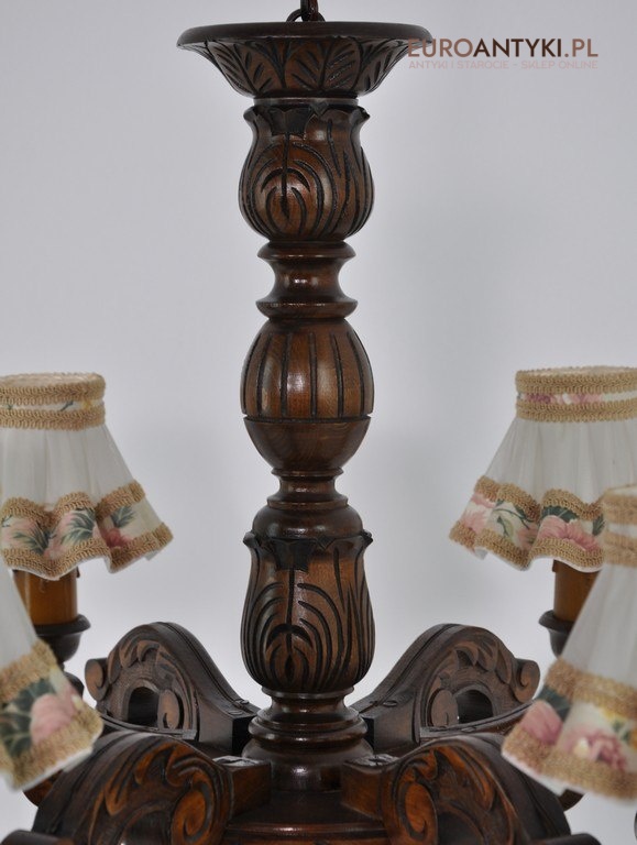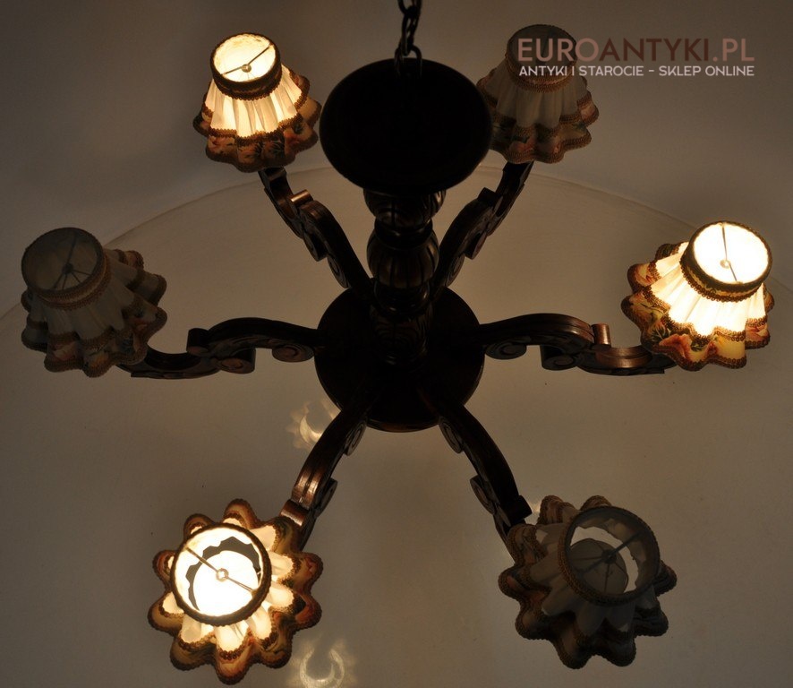Ekskluzywny zyrandol , wykonany z litego drewna . Oryginalne abazurki .Przedmiot kupiony na gieldzie antykow w Austrii . Kompletny . Bez uszkodzen . Stan bardzo dobry . Elektryka sprawna .