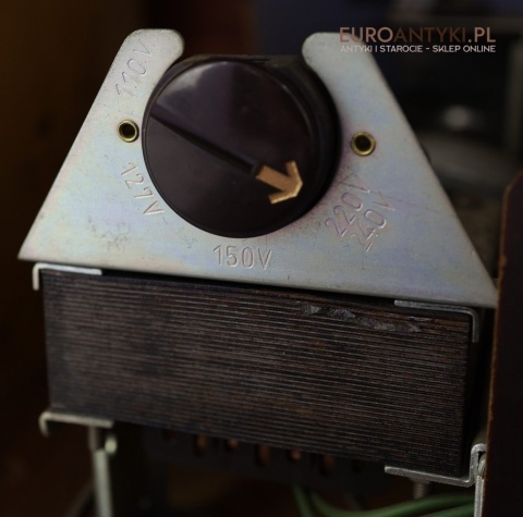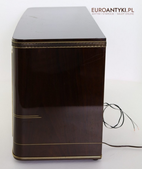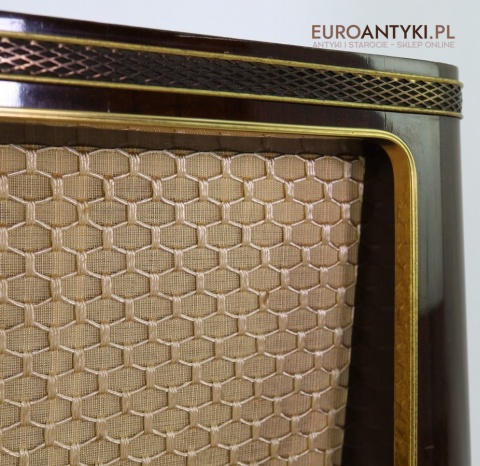 Obudowa radia wykonana została z naturalnego, litego drewna fornirowanego orzechem, co podkreśla jego elegancki i ponadczasowy charakter. Front ozdobiony jest piękną tkaniną o strukturze plastra miodu oraz detalami w kolorze złotym. Takie materiały były stosowane w latach 50. w najlepszych modelach radioodbiorników, a dziś są wyjątkowo cenione – obecnie tak solidne wykonanie jest rzadkością ze względu na wysokie koszty produkcji i wymagające rzemiosło.