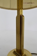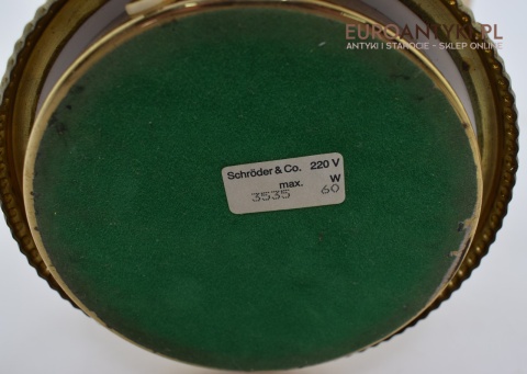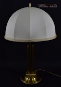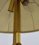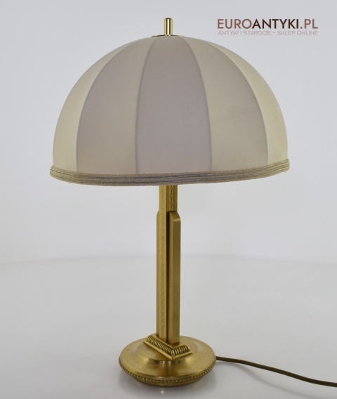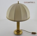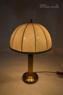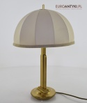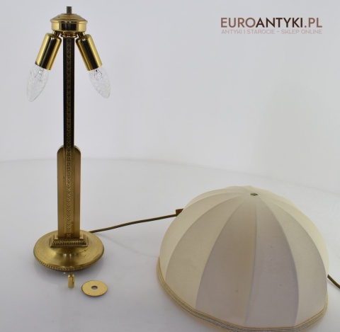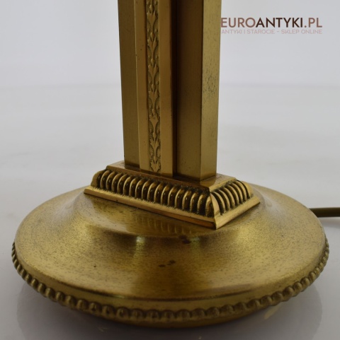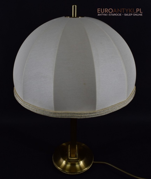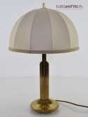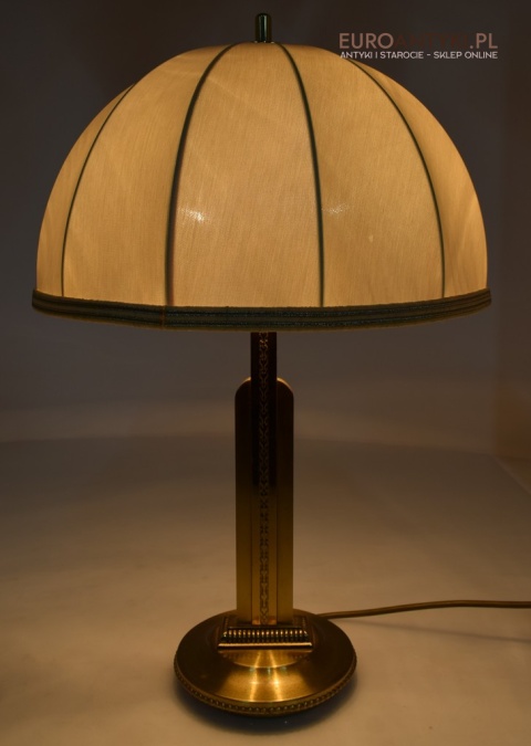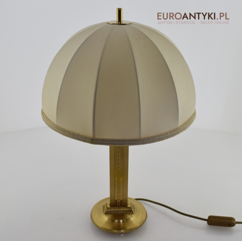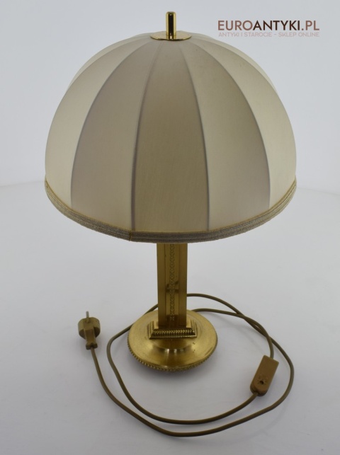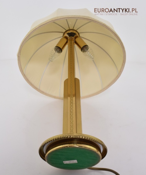 Retro lampa mosiężna z abażurem w gabinetowym klimacie.