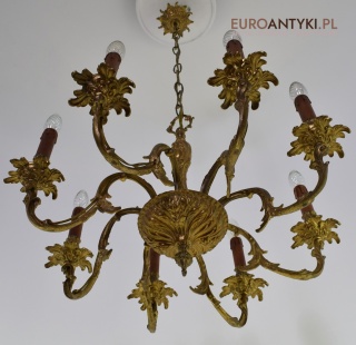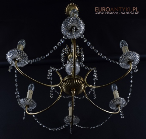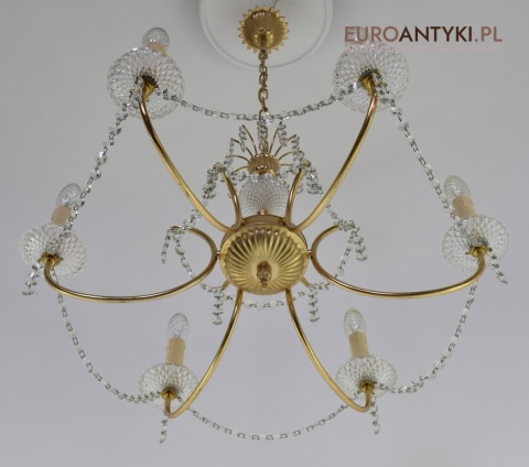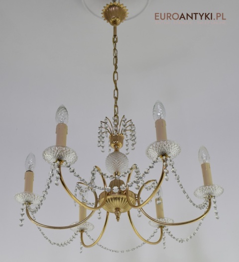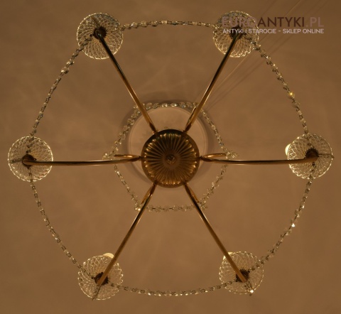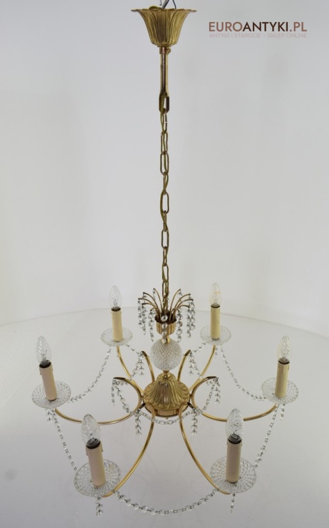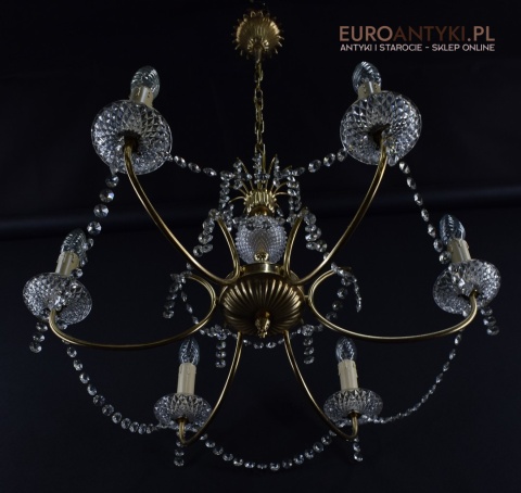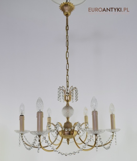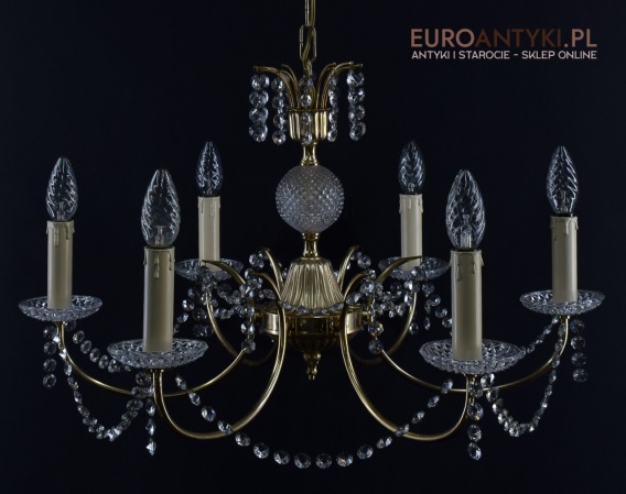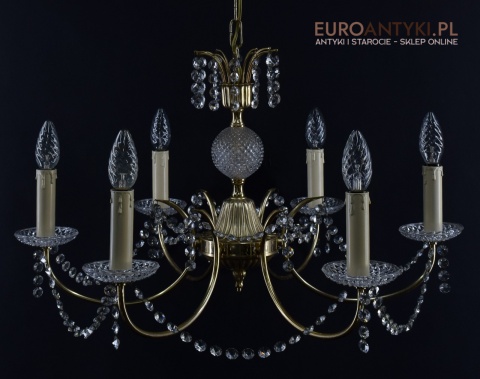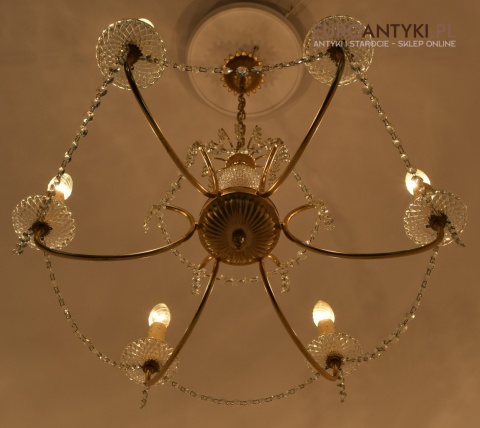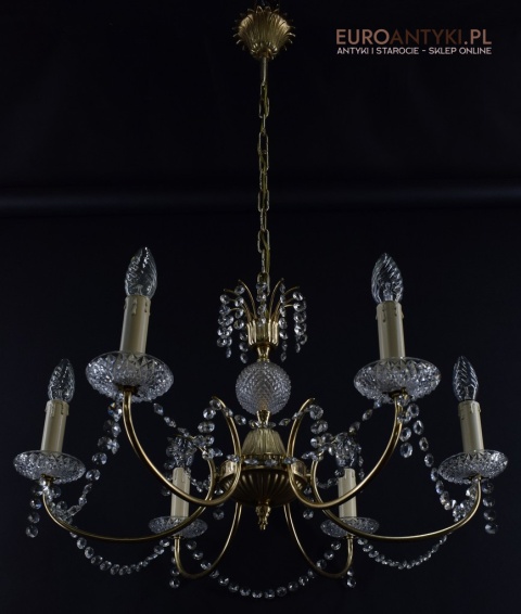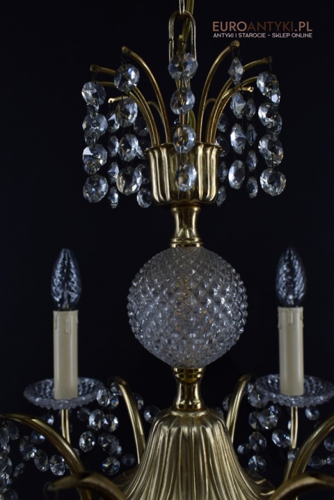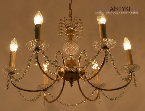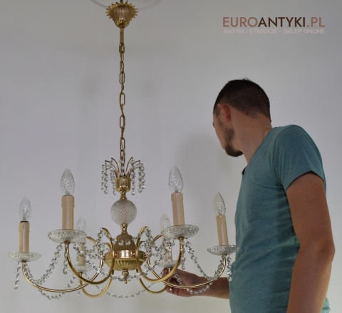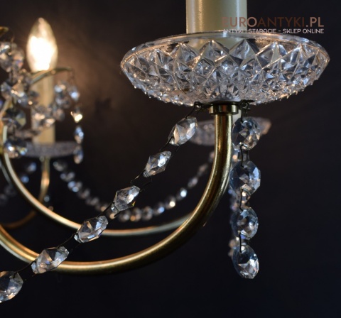 Śliczny mosiężny żyrandol ozdobiony kryształami. Lampy retro, vintage.