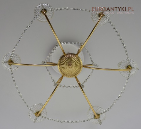 Sprowadzony z Austrii, pochodzi z połowy ubiegłego wieku. Wykonany z mosiądzu + prawdziwe kryształowe zawieszki. Zawieszki kryształowe powodują rozszczepienie światła i widać piękne tęczowe kolory. Ciężko ten efekt uchwycić na zdjęciach, ale w realu wygląda to zjawiskowo. 100% kompletne, w bardzo dobrym stanie.