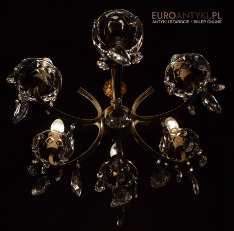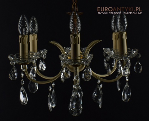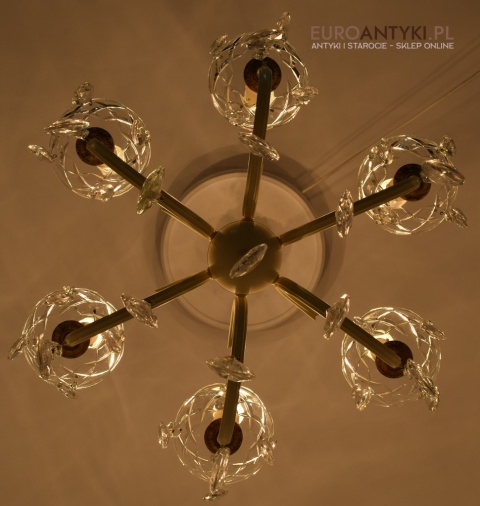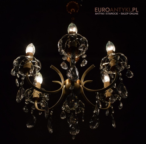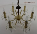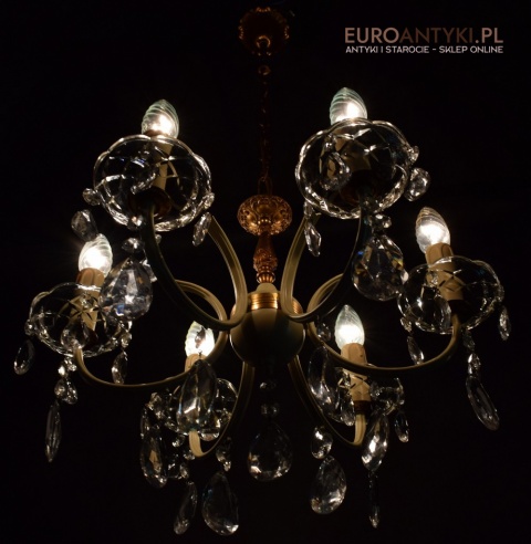 Ten piękny, retro żyrandol to prawdziwa perełka dla miłośników antyków i vintage. Wykonany z mosiądzu i ozdobiony prawdziwymi kryształowymi zawieszkami, ten stary żyrandol pochodzi prosto z Francji z połowy ubiegłego wieku. Wykonany z mosiądzu częściowo pomalowanego na kremowy kolor.