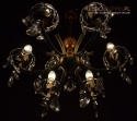 Całość bez uszkodzeń. Przedmiot kompletny, profesjonalnie wyczyszczony. Elektryka sprawna - sprawdzana przez naszego fachowca. Standardowe gniazda elektryczne typu E14. Obecnie można kupić żarówki LED o różnym natężeniu, różnej barwie światła i różnym wyglądzie. Nawet mała żarówka może być dużej mocy i nie będzie pobierać wielu watt, przez co nie przegrzewa i nie uszkodzi kabli elektrycznych. Wszystkie lampy wysyłamy bez żarówek. Żarówki tego typu są łatwo dostępne w sklepach elektrycznych lub w internecie.