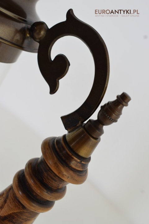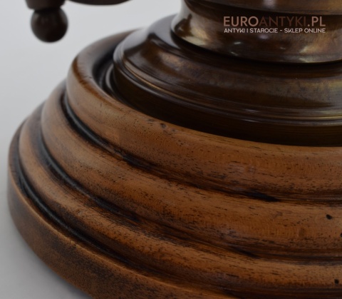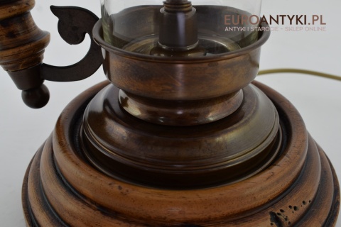 Drewno o ciepłym odcieniu łączy się z mosiężnymi akcentami i szklanym kloszem, tworząc lampkę o niezwykłej estetyce, którą z dumą sprowadziliśmy z Francji. Lampa ta jest kompletna i znajduje się w idealnym stanie, z elektryką w pełni wymienioną na nową, zapewniającą bezpieczeństwo i wygodę użytkowania na co dzień.