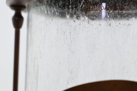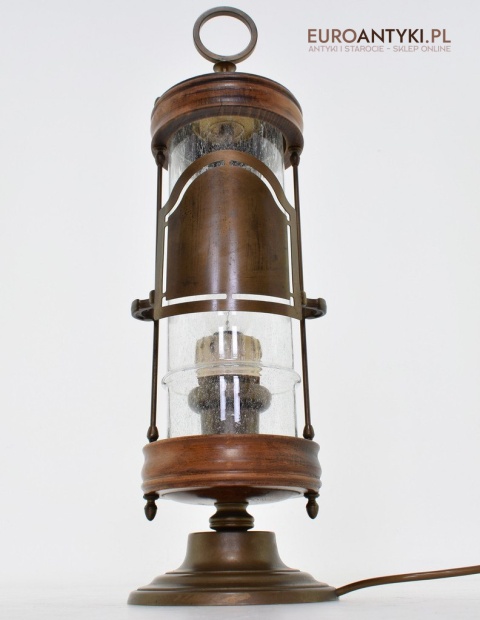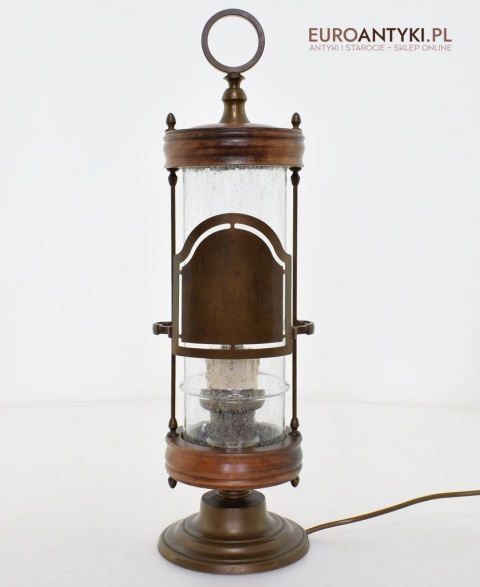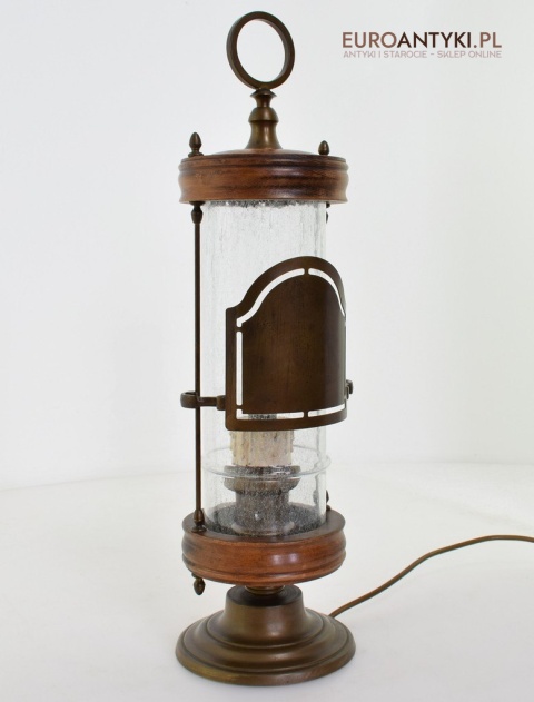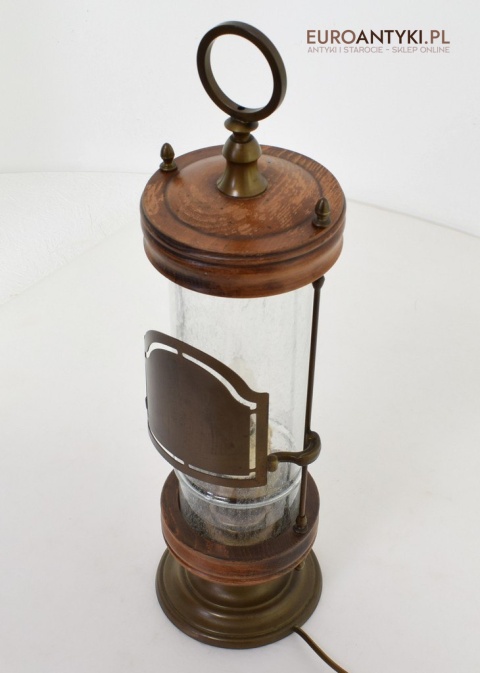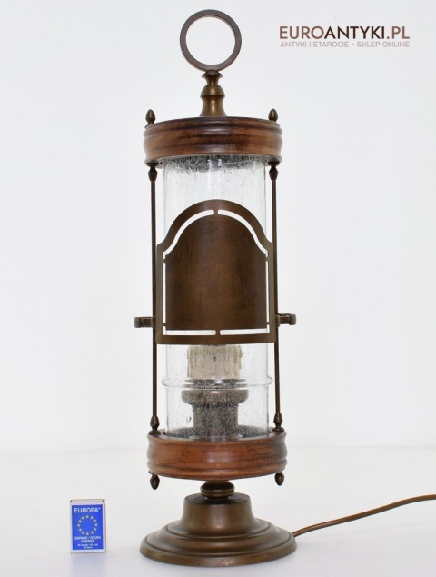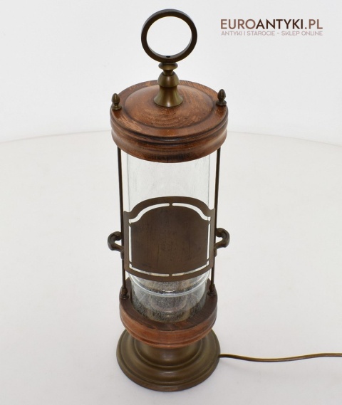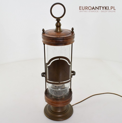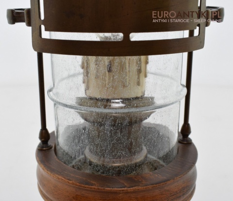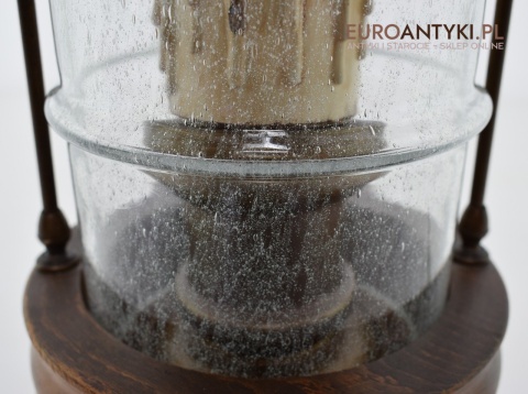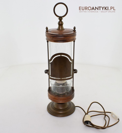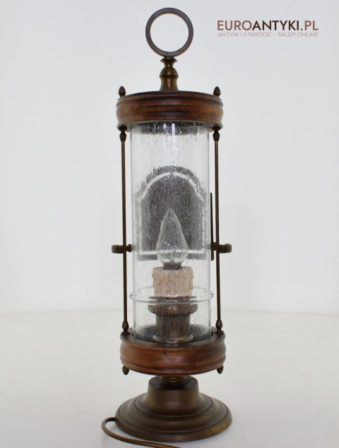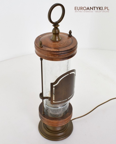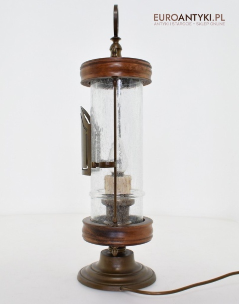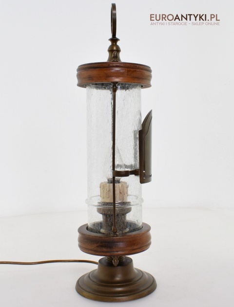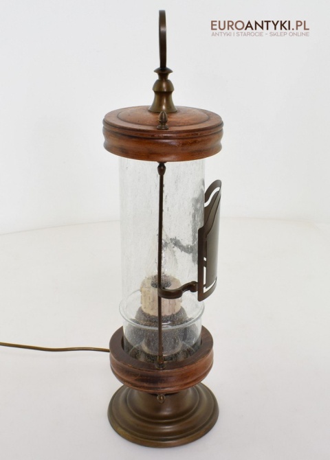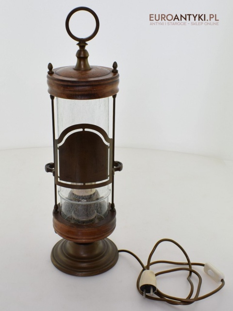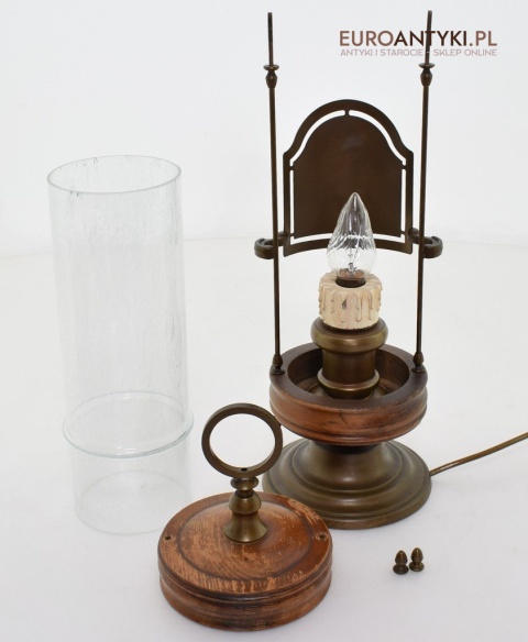 Wykonana z litego drewna, mosiądzu i szklanego klosza w formie walca. Klosz jest robiony specjalną techniką, w szkle są bąbelki powietrza, co dodaje uroku i jest typowe w lampach rustykalnych. Stan tej uroczej lampy stołowej, oceniam na bardzo dobry. Klosz jak i cała lampka jest w idealnym stanie. Kompletna. Elektryka sprawna. Standardowe gniazdo typu E14. Max 60 watt. W dzisiejszych czasach piękne energooszczędne ledowe żarówki wykonane w stylu retro i vintage, można kupić w sklepach elektrycznych lub internetowych. Takie żarówki mogą być większej mocy bo nie pobierają tyle prądu i nie nagrzewają oprawki i kabli jak te starsze żarówki.