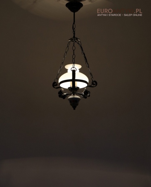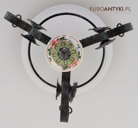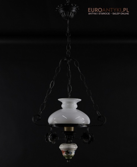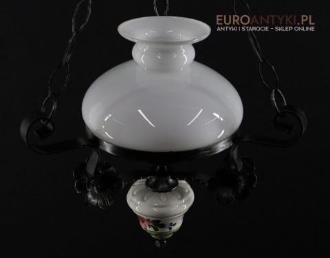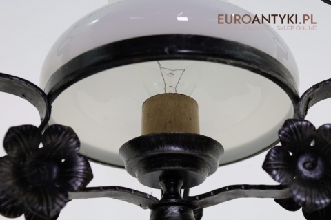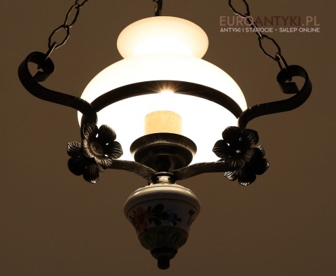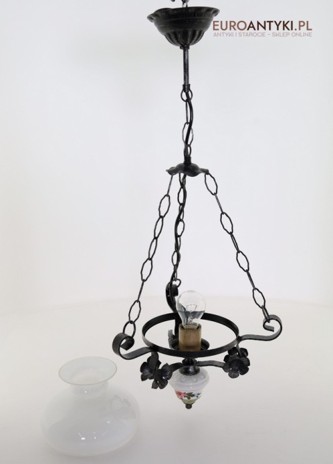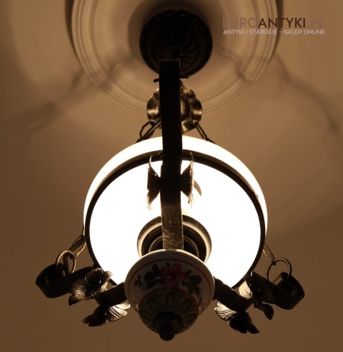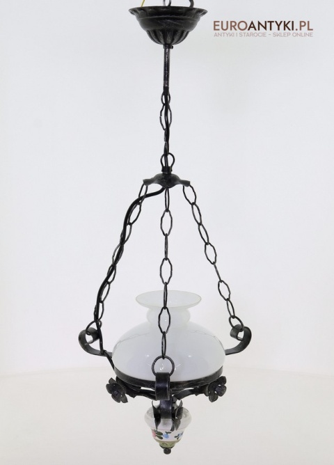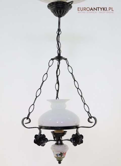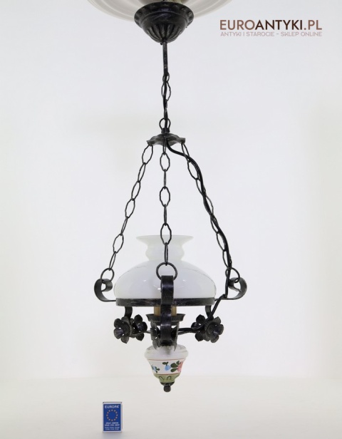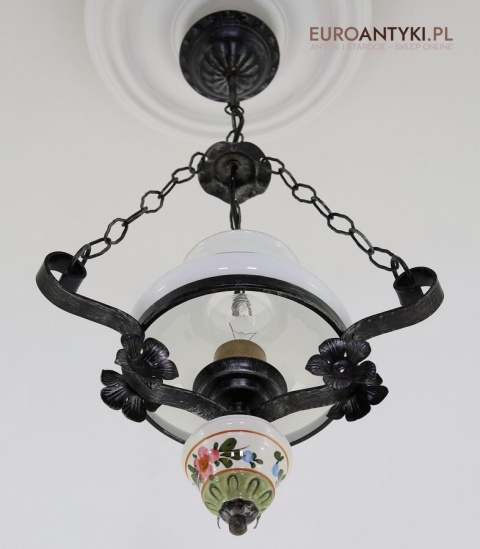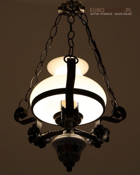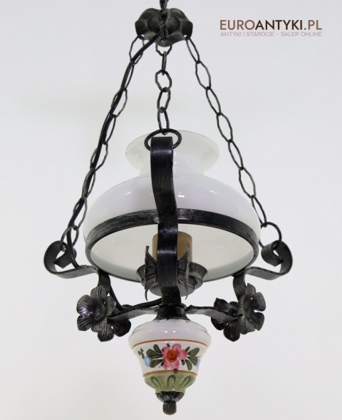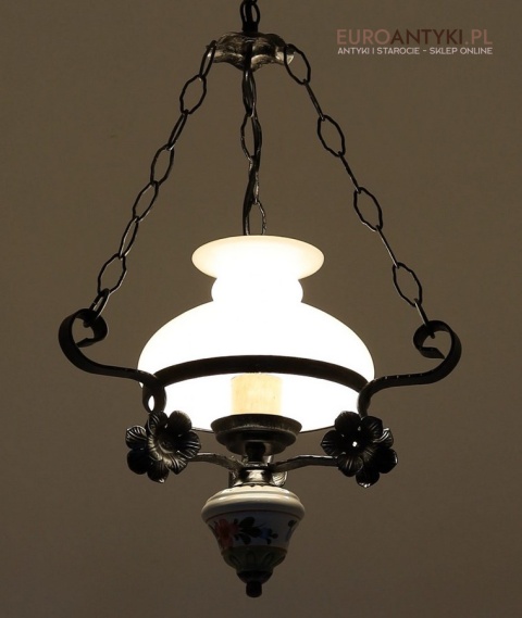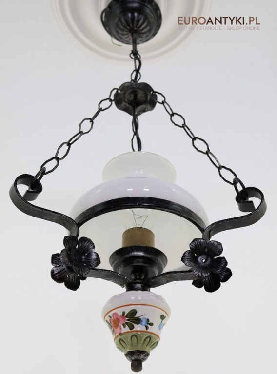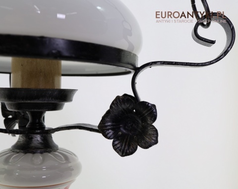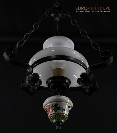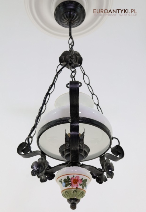Lampa wykonana została z kutej stali, ręcznie patynowanej na kolor czarno-srebrny, co nadaje jej wyjątkowego, postarzanego charakteru. W centralnej części umieszczony jest szklany klosz w mlecznobiałym odcieniu – w idealnym stanie, bez żadnych uszkodzeń. U dołu lampy znajduje się ceramiczny element dekoracyjny z malowanymi kwiatami, dodający całości malowniczego uroku i koloru. Konstrukcję dopełniają stylizowane metalowe kwiaty, typowe dla rustykalnych dekoracji z połowy XX wieku.