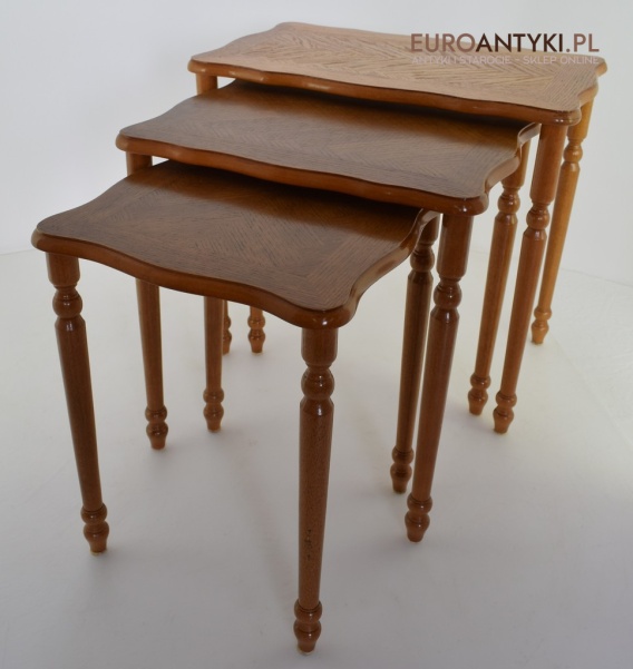 Prezentowane stoliki pomocnicze to nie tylko praktyczne meble, ale także eleganckie elementy dekoracyjne. Wykonane z wysokiej jakości drewna, ozdobione misternymi intarsjami, nawiązującymi do stylu Biedermeier, charakteryzują się wyjątkową trwałością i estetyką. Stoliki można wsunąć jeden pod drugi, co pozwala na oszczędność miejsca i funkcjonalne wykorzystanie przestrzeni.