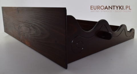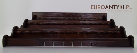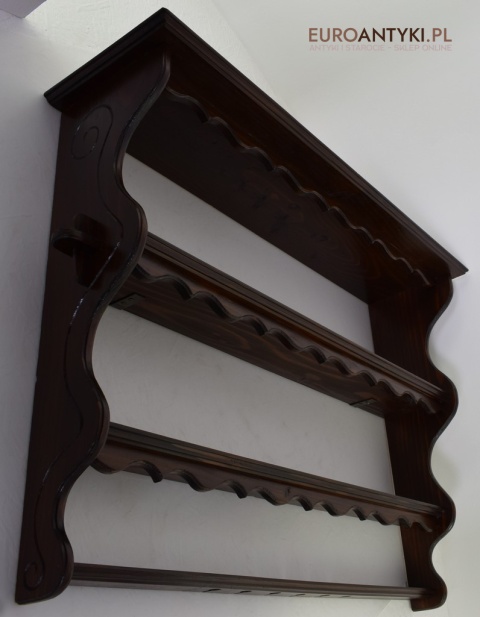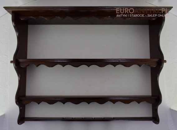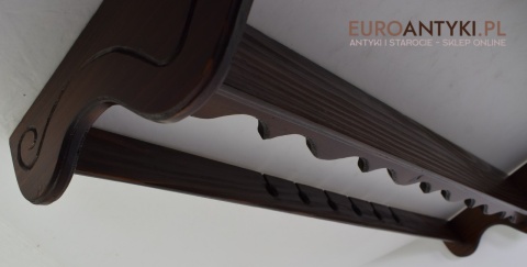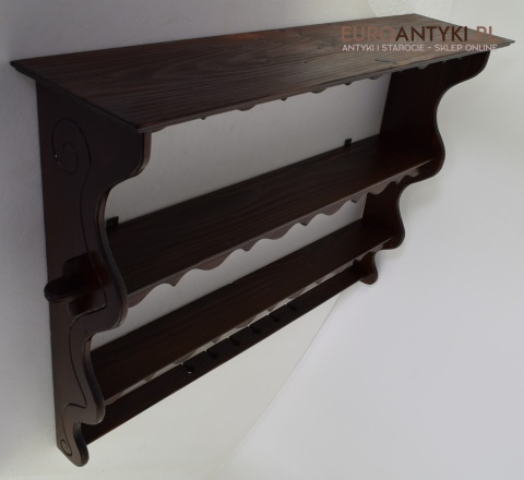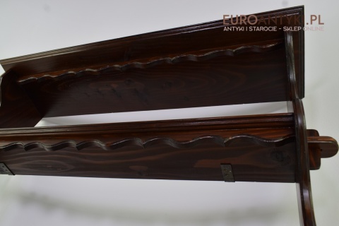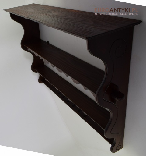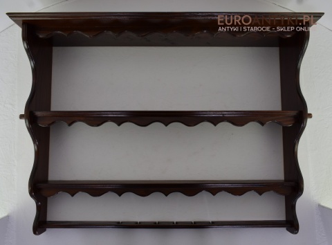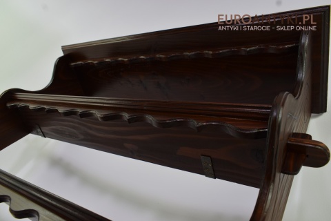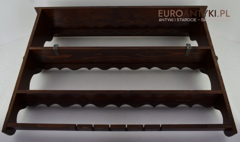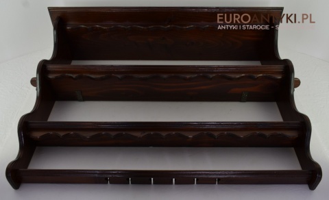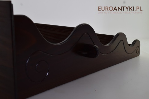 Ta pięknie wykonana i solidna półka/szafeczka zyskała swoje miejsce w sercach miłośników antyków dzięki specjalnym otworom na spodzie, które służą do prezentacji ozdobnych łyżek, nadając wnętrzu osobistego charakteru. Z dumą informujemy, że półka ta nie posiada śladów po drewnojadach, co świadczy o jej dobrej konserwacji i dbałości o detale przez poprzednich właścicieli.