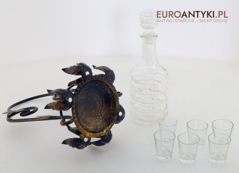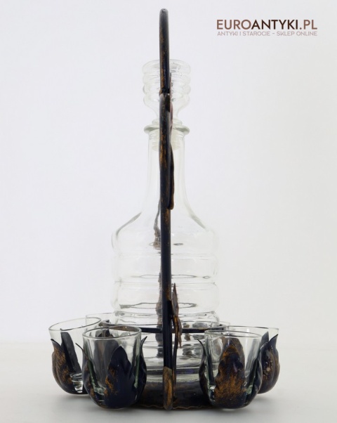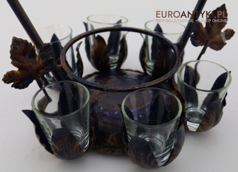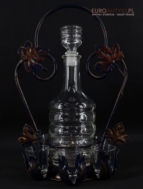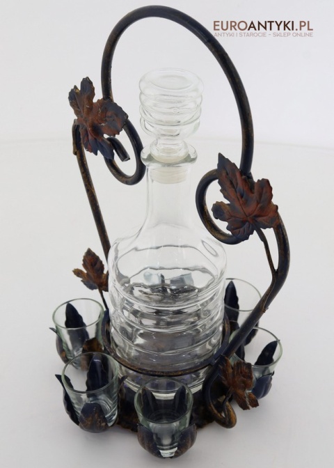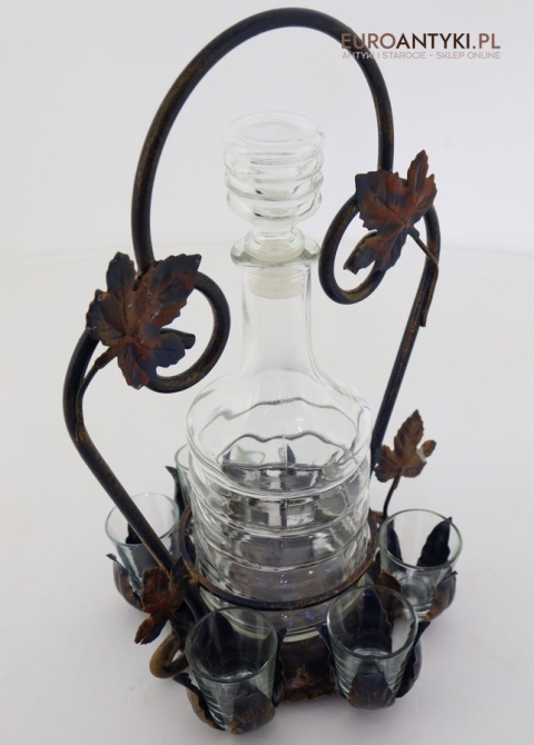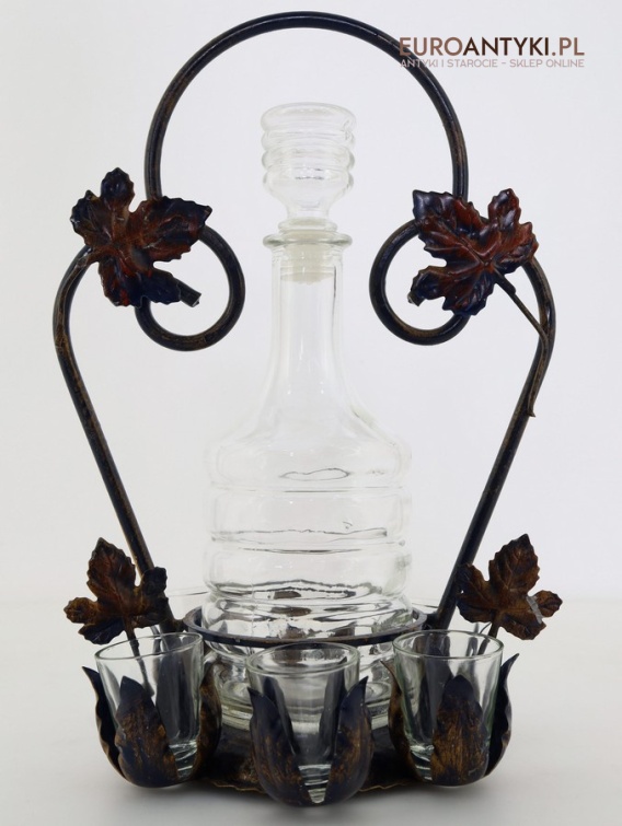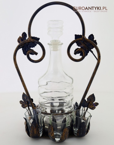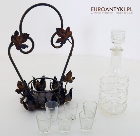 Przedstawiamy starodawny, rustykalny zestaw biesiadny składający się z metalowego kosza, szklanej karafki oraz sześciukieliszków, z których jeden jest nieco wyższy – tradycyjnie przeznaczony dla gospodarza!