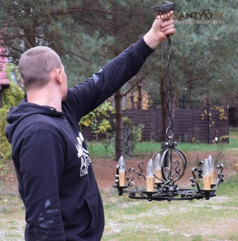 Rustykalny metalowy kuty żyrandol do kuchni, karczny, knajpy, gospody.