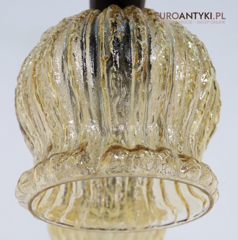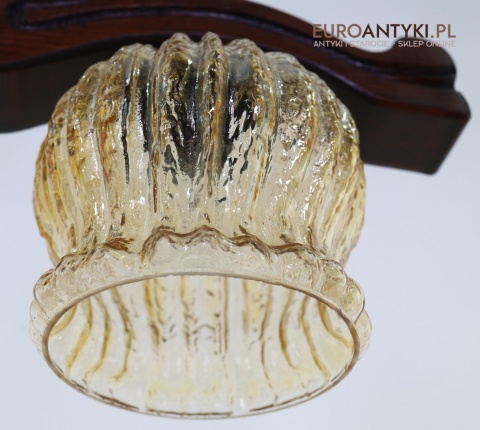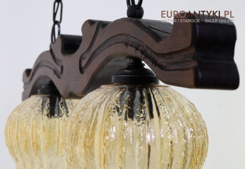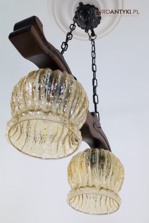 Żyrandol posiada dwa lekko opalizujące klosze w kształcie delikatnie pofalowanych kielichów, które tworzą ciepły, nastrojowy blask po zapaleniu światła. Szklane klosze o złocistym odcieniu idealnie kontrastują z surowością drewna i dodają całości elegancji.