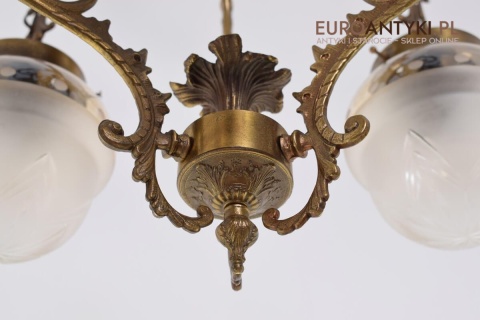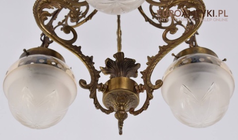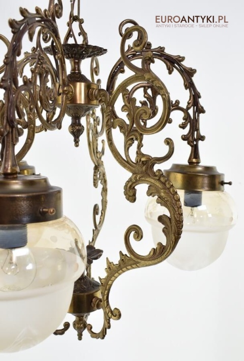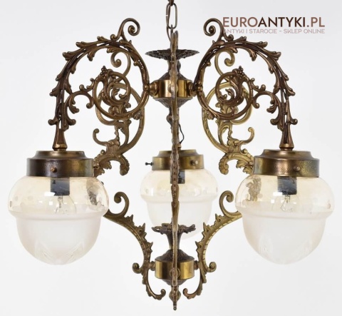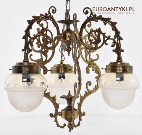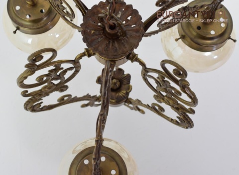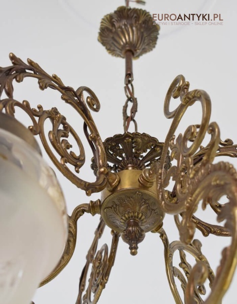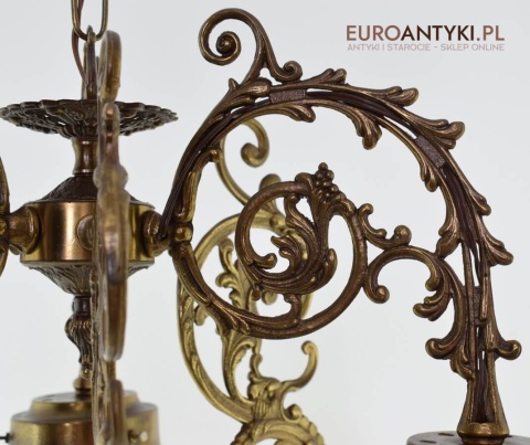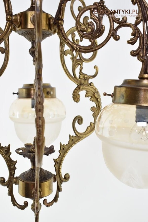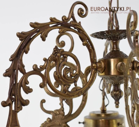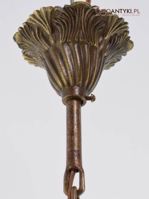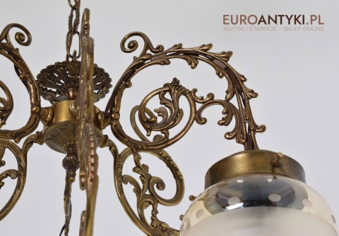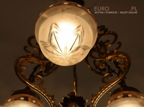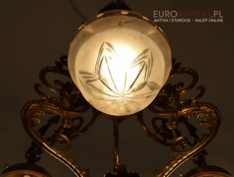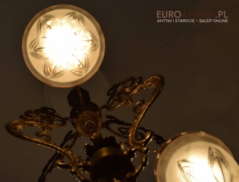 Królewski żyrandol wykonany z masywnych odlewów mosiężnych pierwszej jakości jest sprowadzony z Francji i pochodzi z okresu międzywojennego. Klosze szklane szlifowane - bez uszkodzeń. Lampa ta to prawdziwa perełka w pomieszczeniu. Gdybyśmy mieli wyższe sufity w domu to już by wisiała u nas na stałe w ganku lub łazience. Wygląd tej lampy mówi sam za siebie, tu nie trzeba nic słodzić. Wykonaliśmy 35 zdjęć które dokładnie odwzorowują piękno i unikalność tej starej lampy.