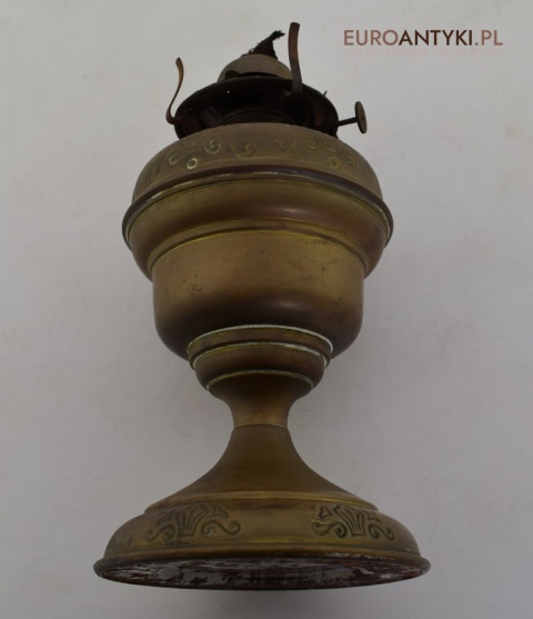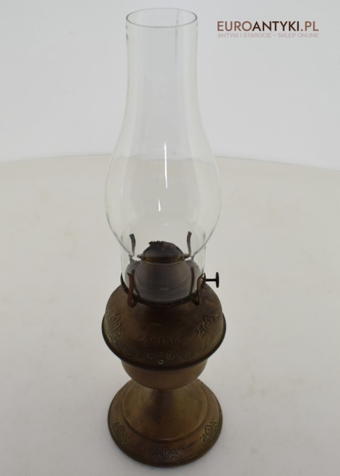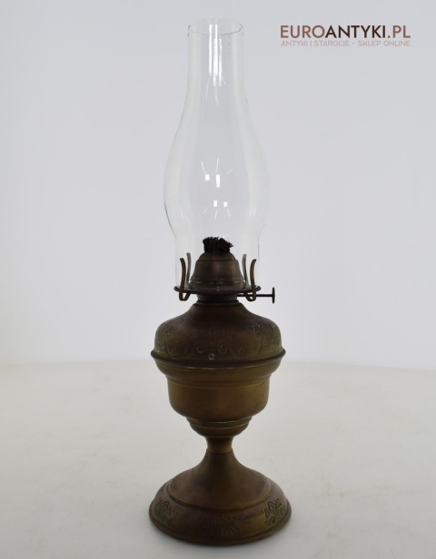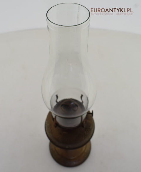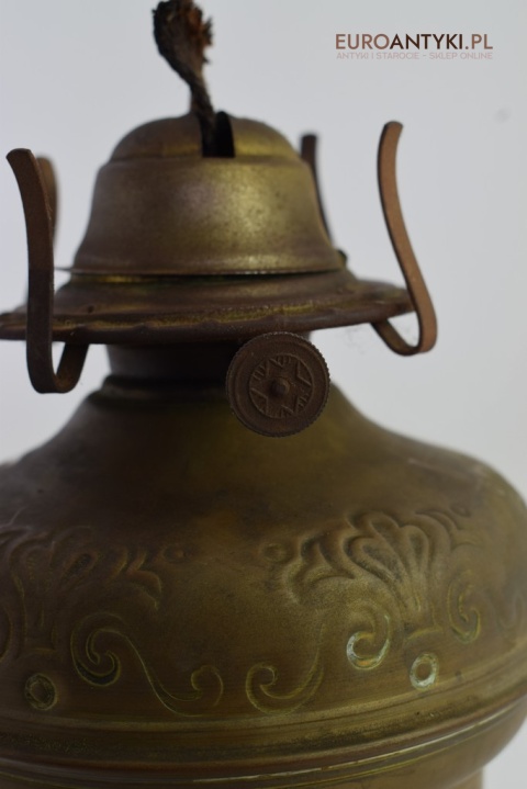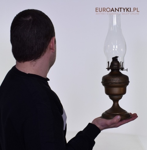 Sprawna muzealna lampa naftowa z mosiądzu. Sklep z antykami.