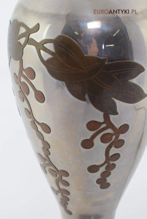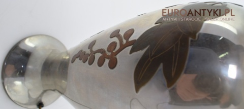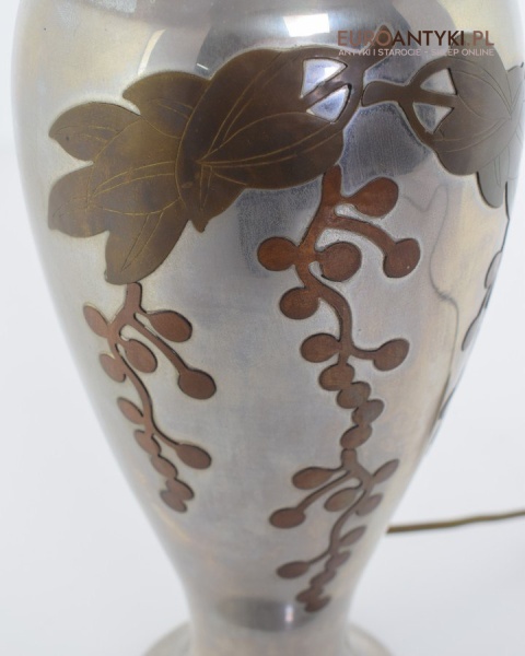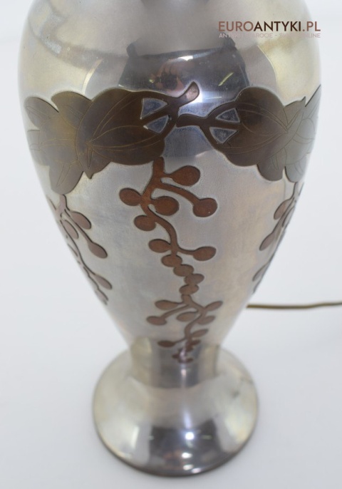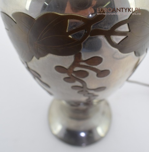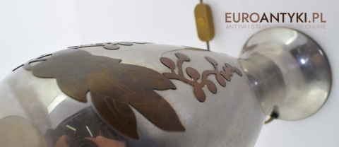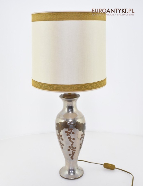 Starodawna duża lampa wykonana z jakiegoś metalu o kolorze srebrnym. Widać że to porządny metal bo nie ma na nim ani kropki rdzy. Widoczny nalot, patyna, czyli znaki starości które dodają antykom sznytu i charakteru. Proszę zwrócić uwagę na piękne ozdoby wykonane z blachy miedzianej - liście winorośli. Abażur w bardzo dobrym stanie. Lampa stoi bardzo stabilnie bo ma obciążenie w stopie.