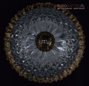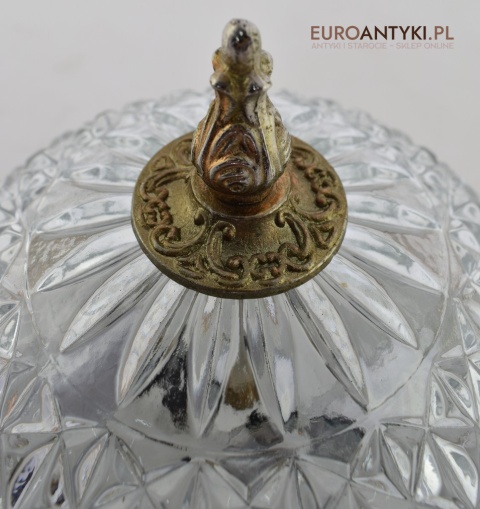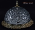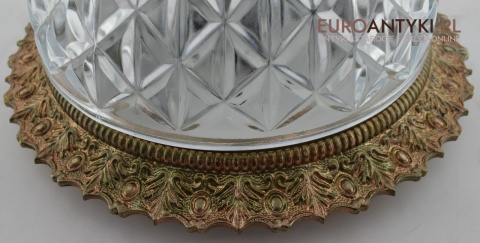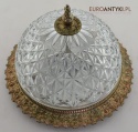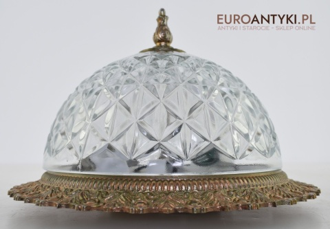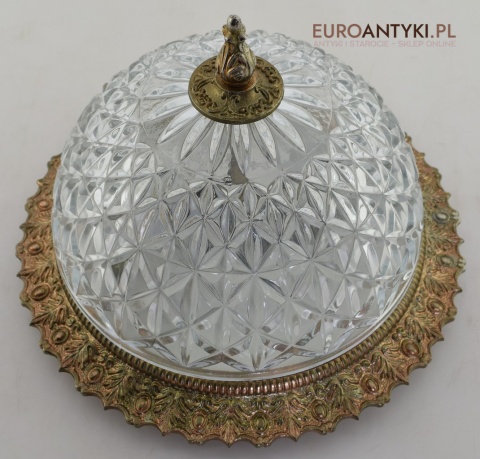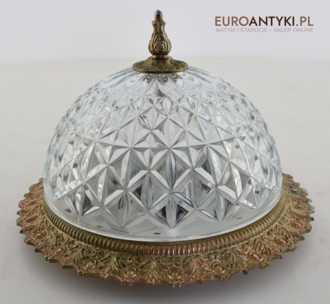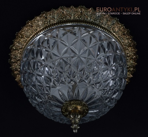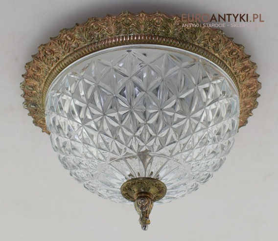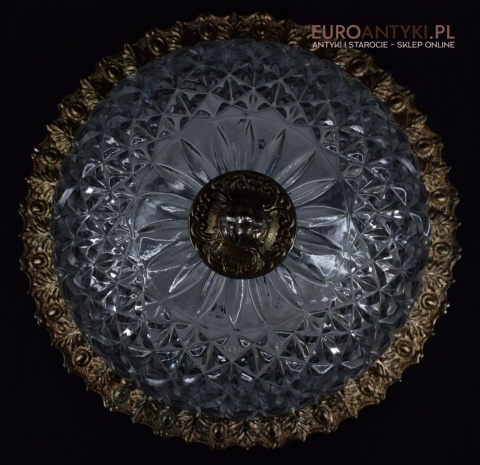Nietuzinkowy plafon wykonany z mosiądzu o kolorze starego złota. Klosz z masywnego karbowanego szkła.