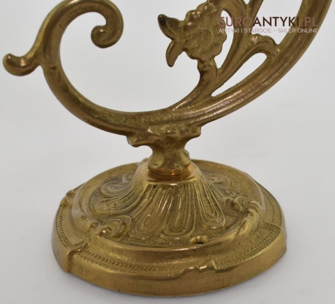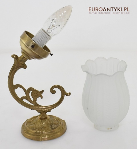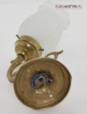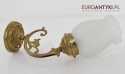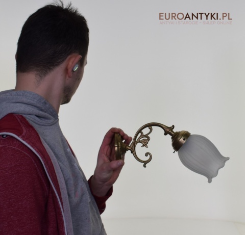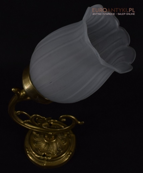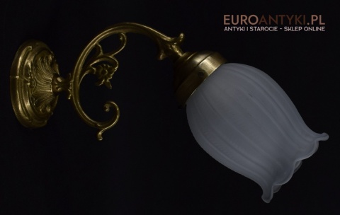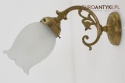 Starodawny, stylowy mosiężny kinkiet z florystycznym kloszem.