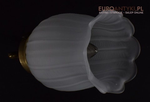 Sprowadzony z Francji. Pochodzi z około 1970 roku. Wykonany z masywnych odlewów mosiężnych - nie jest tylko mosiądzowany! Klosz z grubego szkła w formie kielicha kwiatowego.
