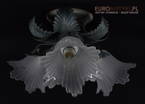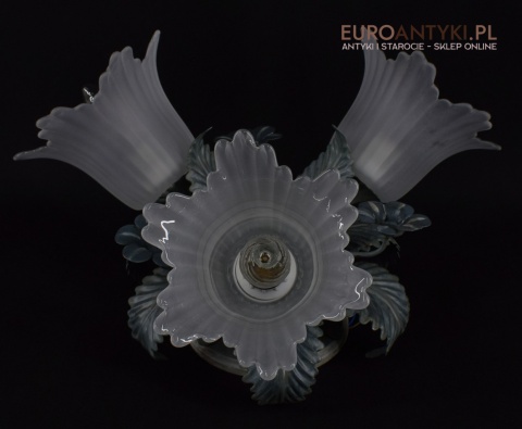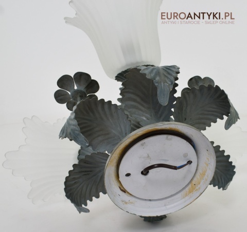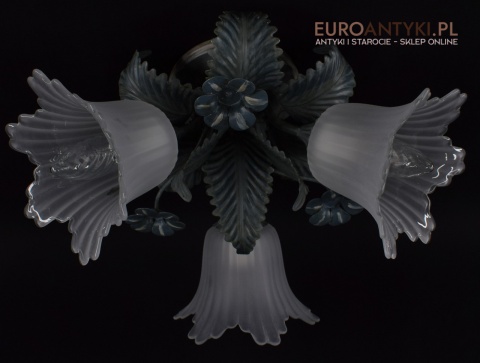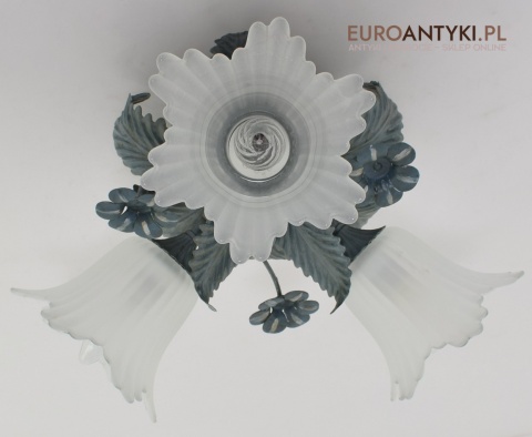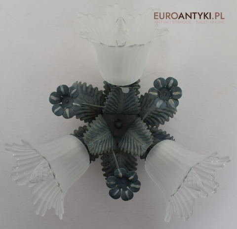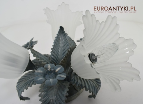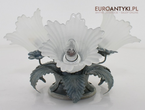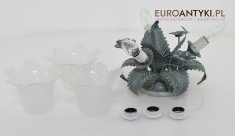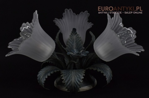 Sprowadzony z Francji. Pochodzi z około 1970 roku. Wykonany z metalu + 3 grube szklane klosze w formie kielichów kwiatowych - w idealnym stanie.