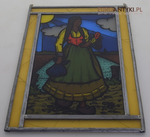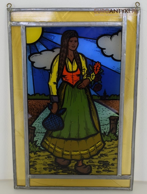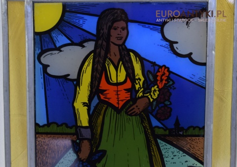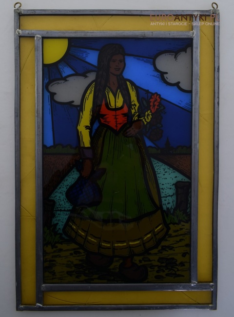 Stary witraż z kobietą z kwiatami. Duży zabytkowy witraż.