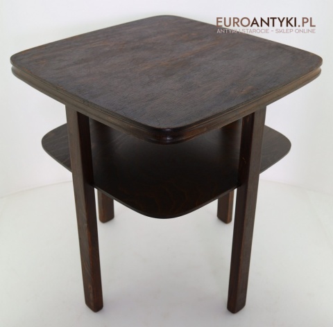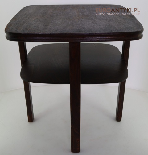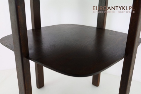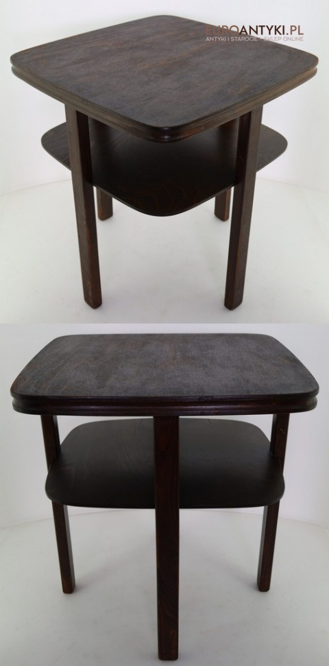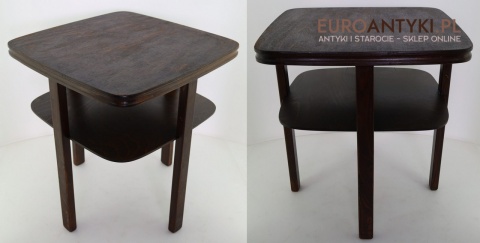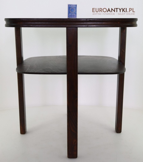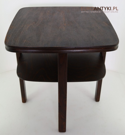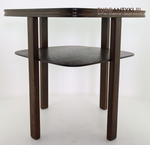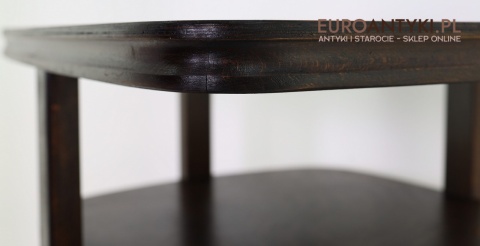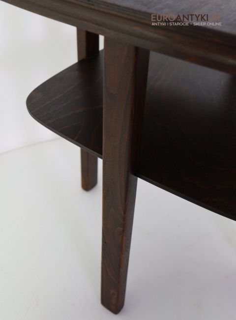 Prezentowany stolik pochodzi z połowy XX wieku i reprezentuje klasyczny styl modernistyczny. Charakteryzuje się prostą, minimalistyczną formą, zaokrąglonymi krawędziami oraz praktyczną dolną półką, która zwiększa jego funkcjonalność. Wykonany z litego drewna - 6 kg! Stolik wyróżnia się ciemnym wykończeniem, które podkreśla jego elegancki i ponadczasowy charakter. Sprowadzony z Francji.