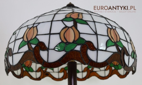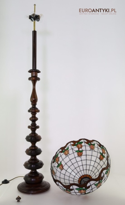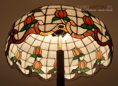 Przedstawiamy starodawną i niepowtarzalną lampę podłogową w stylu TIFFANY, z witrażowym kloszem ręcznie wykonanym metodą tradycyjną. Klosz zdobiony motywem stylizowanych tulipanów został wykonany z prawdziwego szkła witrażowego TIFFANY, co nadaje mu wyjątkowy, ponadczasowy charakter. Piękna, toczona ręcznie drewniana podstawa w stylu vintage znakomicie współgra z artystycznym kloszem, tworząc arcydzieło sztuki użytkowej. Lampa sprowadzona z Francji - lata 60./70. XX wieku.