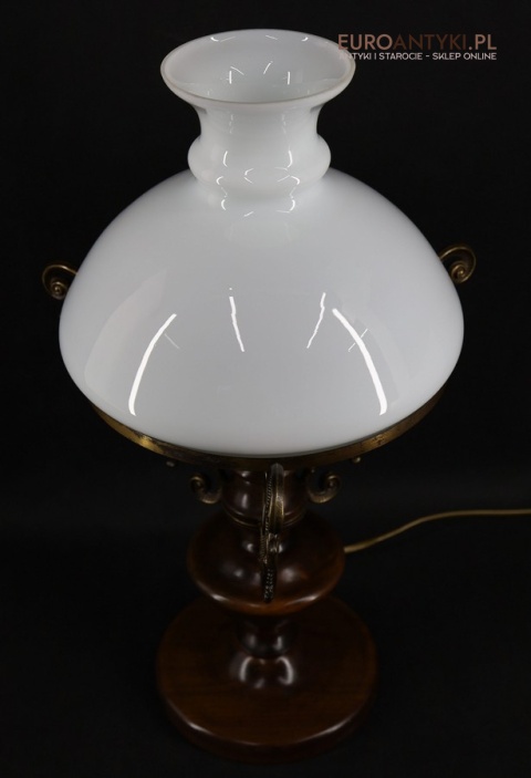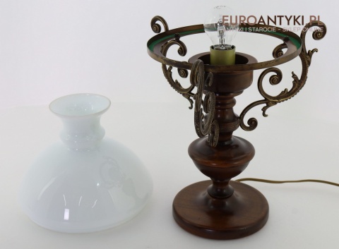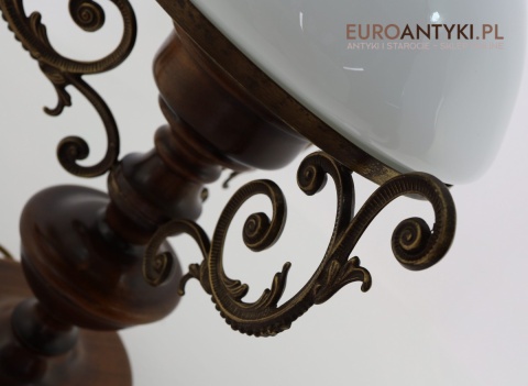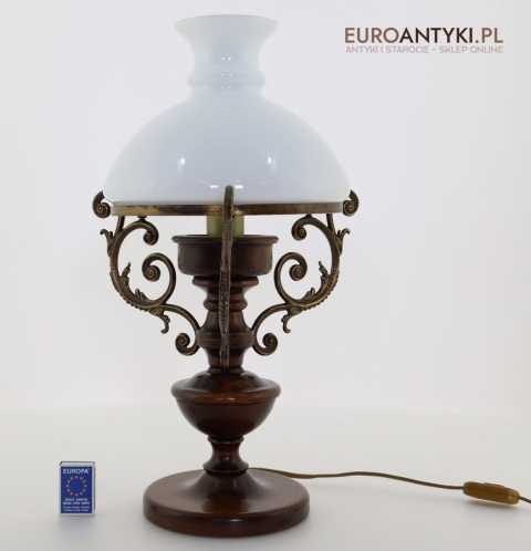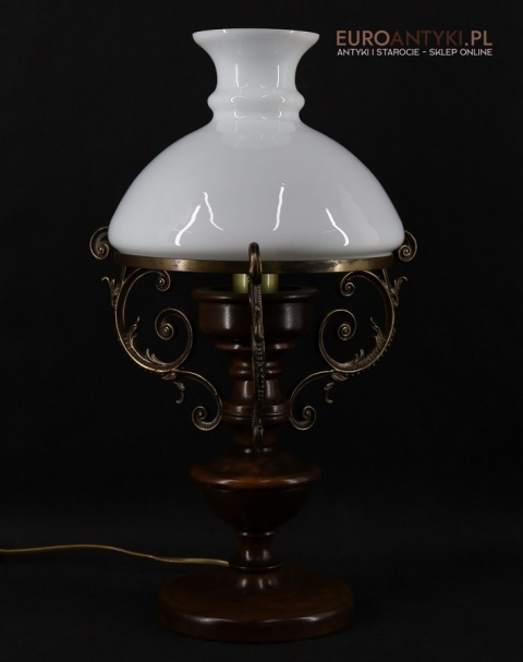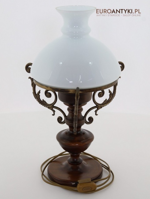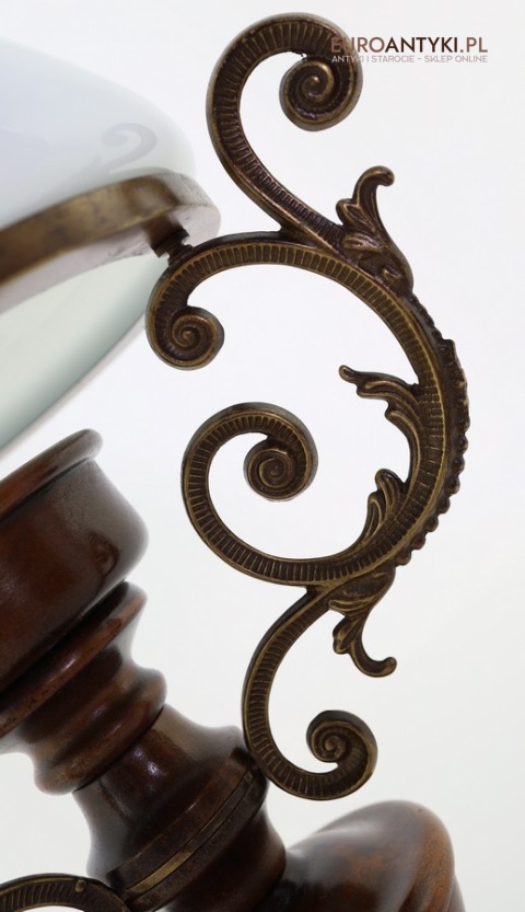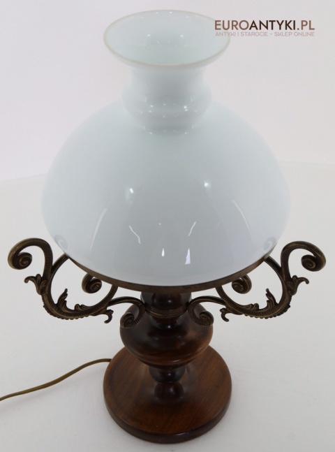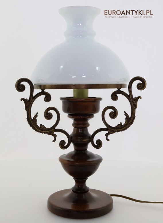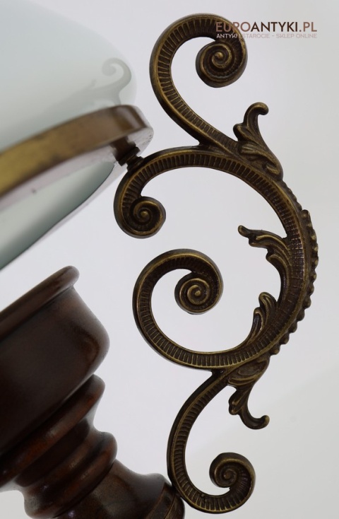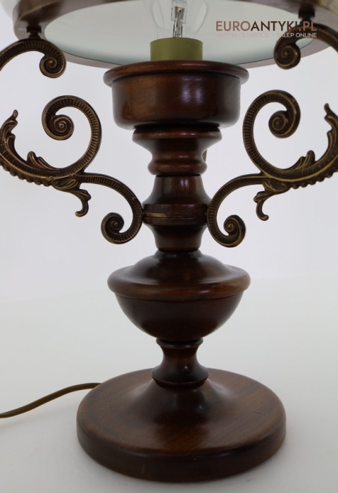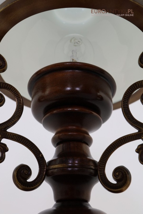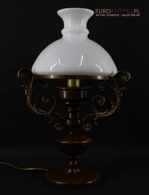 Materiał: Lite drewno (podstawa), dekoracyjne mosiężne zdobienia, szklany mleczny klosz.