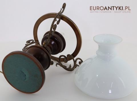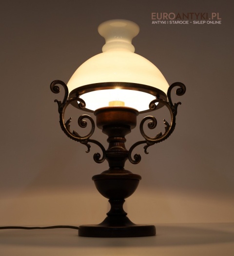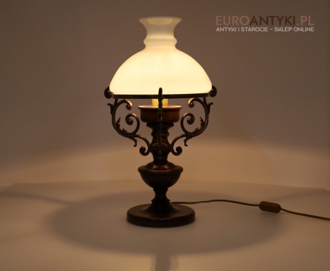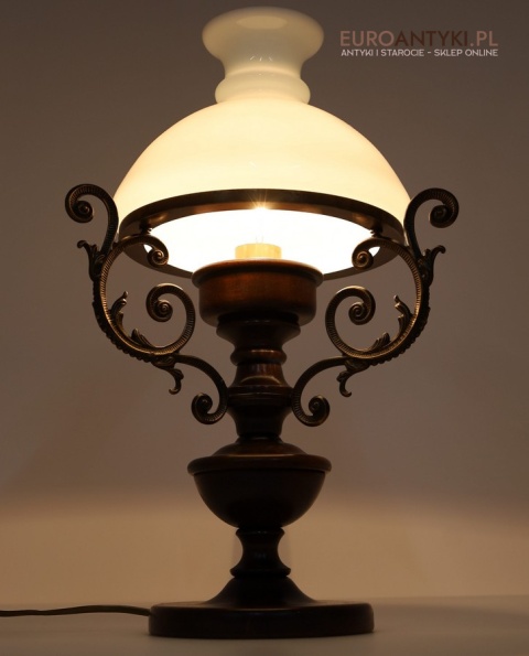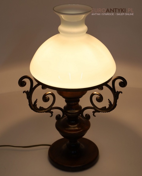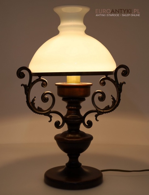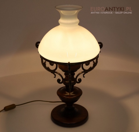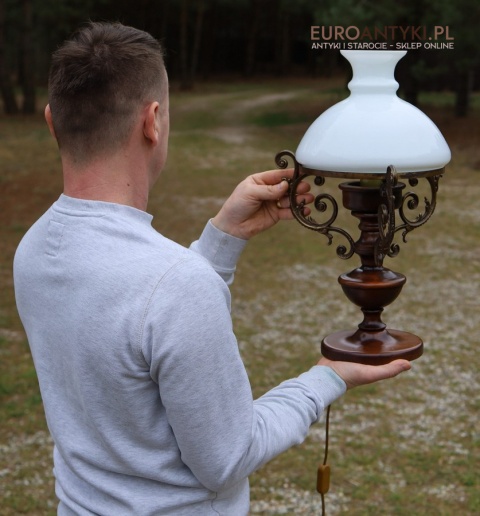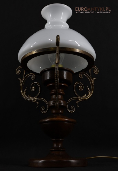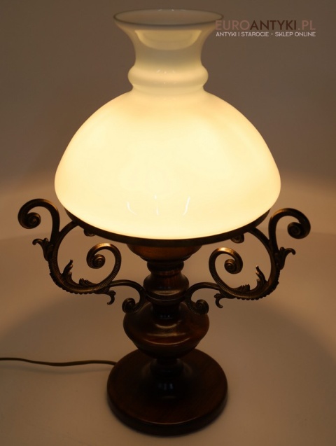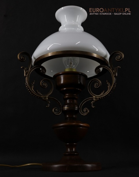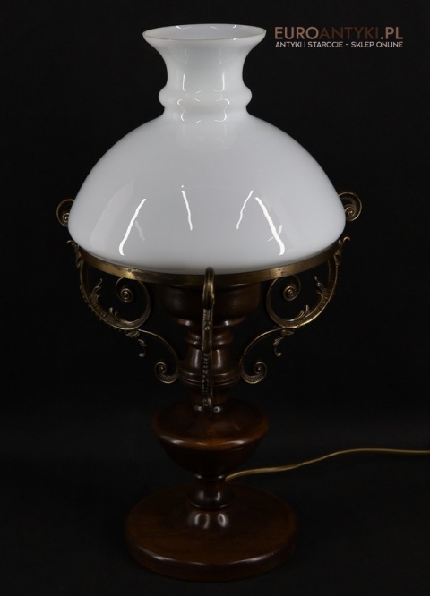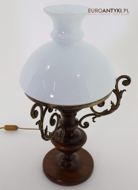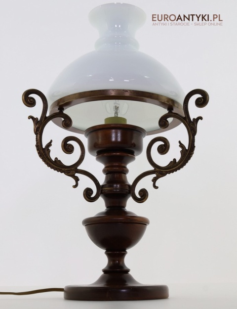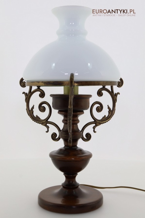Materiał: Lite drewno (podstawa), dekoracyjne mosiężne zdobienia, szklany mleczny klosz.