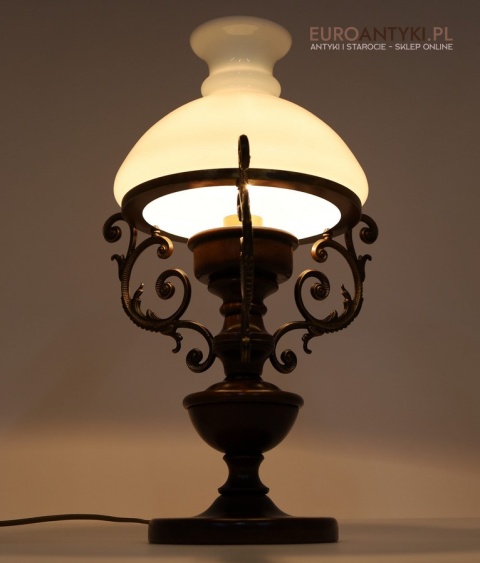 Stylowa drewniana lampka stołowa z mosiężnymi zdobieniami i mlecznym kloszem – klasyczna elegancja vintage