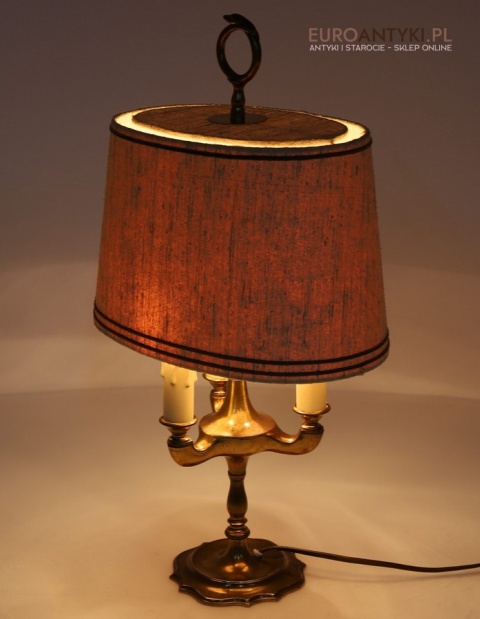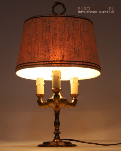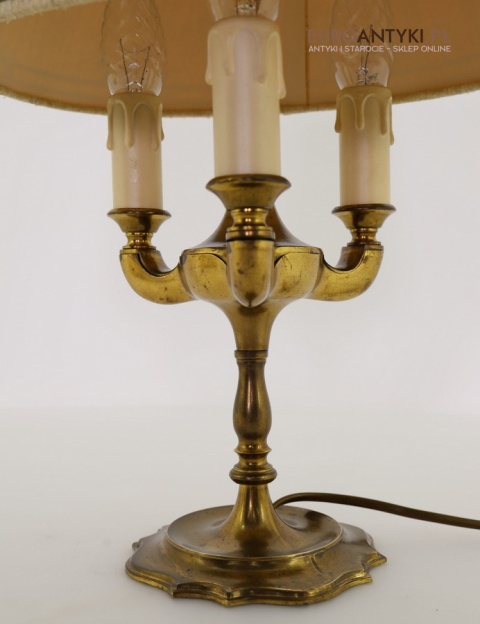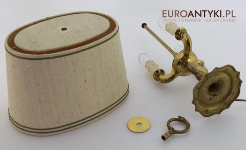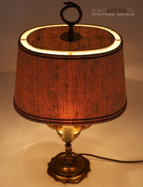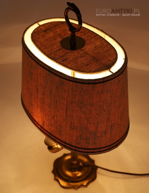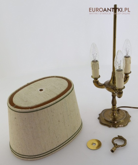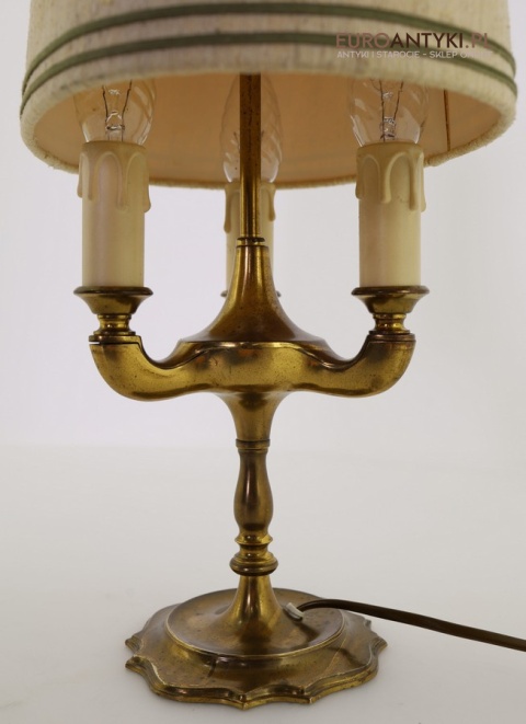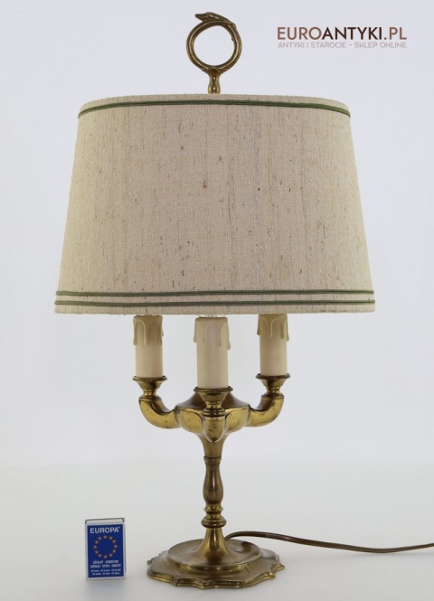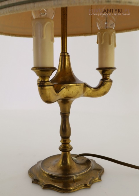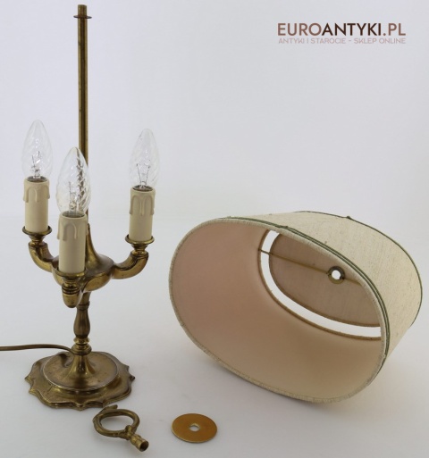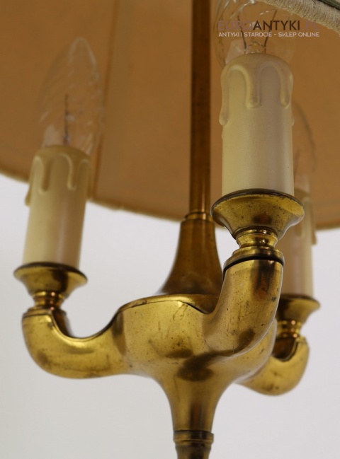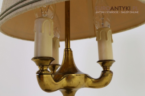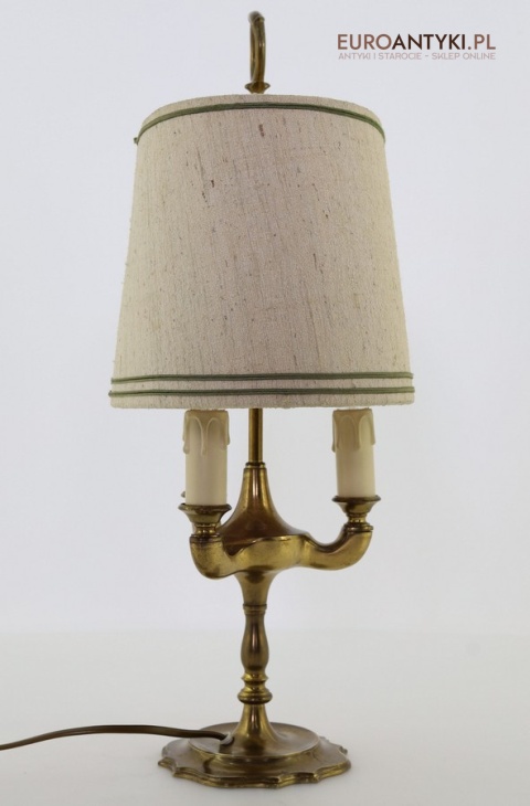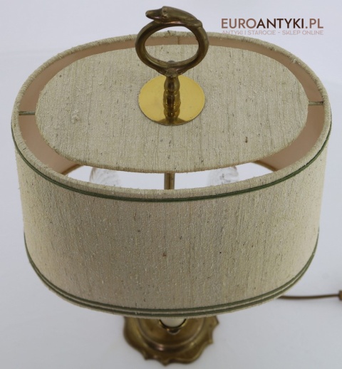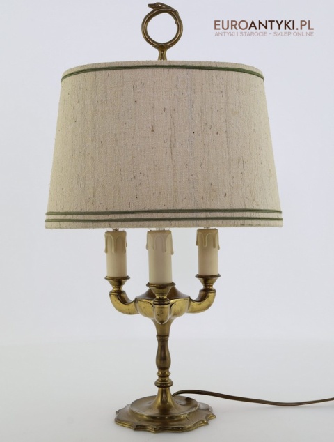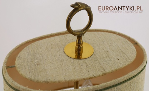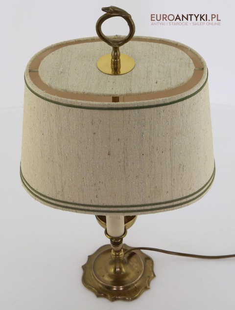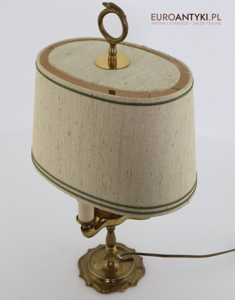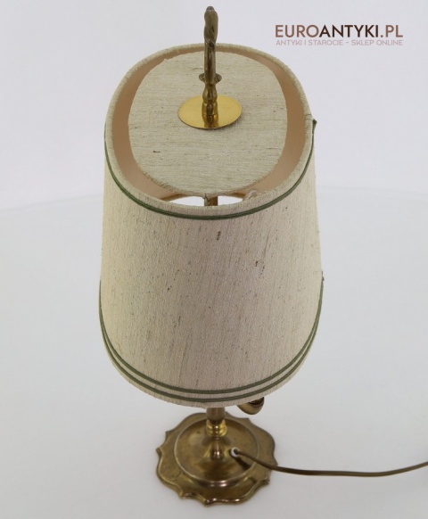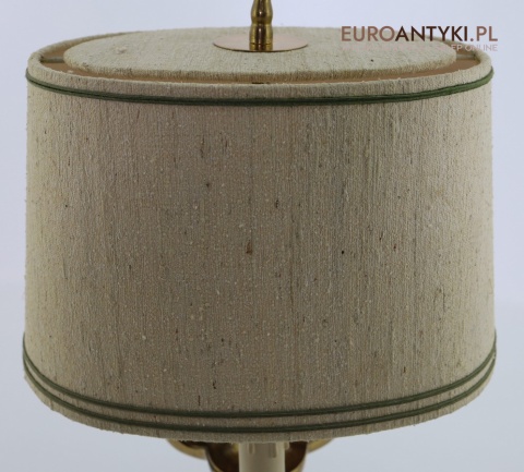 Lampa charakteryzuje się masywną, mosiężną nogą, która zachowała swój oryginalny patynowany wygląd – celowo nie była polerowana, aby zachować swój autentyczny antyczny urok. Klasyczny abażur tekstylny w beżowym kolorze z subtelnymi zielonymi akcentami dodaje całości elegancji i ciepłego charakteru.