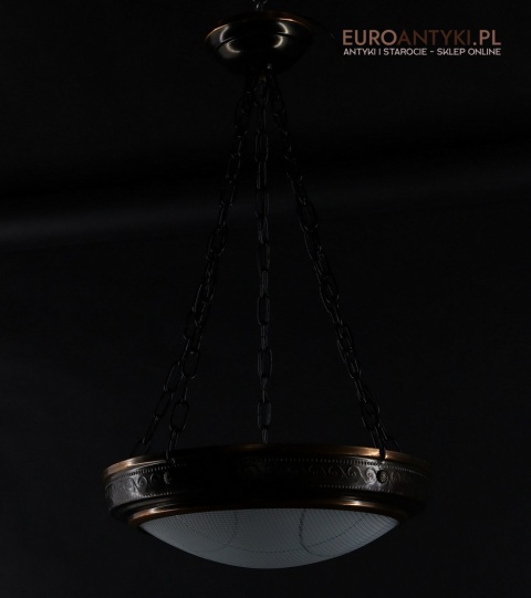 Przedstawiamy starodawną lampę wiszącą w stylu retro, która pochodzi z około 1970 roku. Ten elegancki egzemplarz, sprowadzony z Francji, łączy w sobie mosiężną konstrukcję z delikatnym, szklanym kloszem w doskonałym stanie. Metalowe łańcuchy. Piękne wzory zdobiące obręcz nadają jej klasyczny, nostalgiczny charakter, doskonale komponujący się z wystrojem vintage oraz eklektycznym wnętrzem. Stan lampy - IDEALNY!