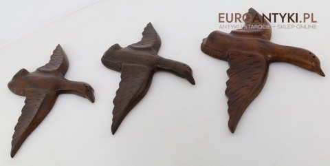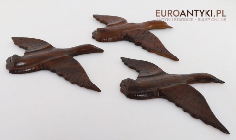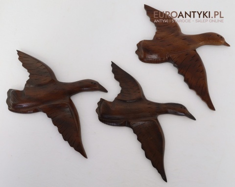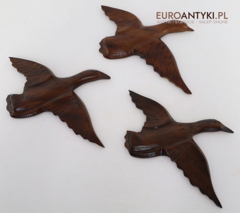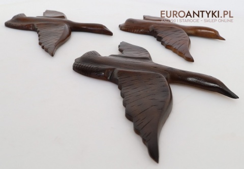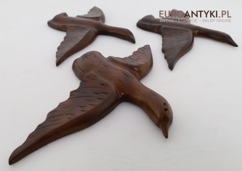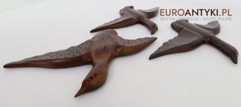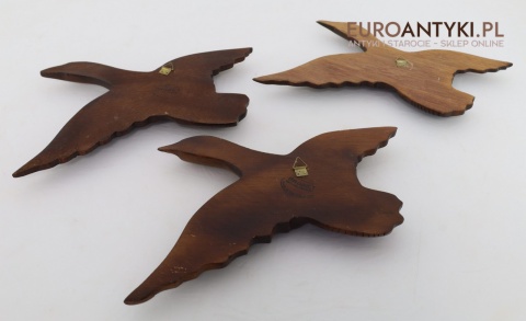 Prezentujemy zestaw rzeźbionych drewnianych ptaków ściennych, idealnych do wnętrz w stylu rustykalnym lub Cottage. Te piękne dekoracje wykonane są z litego drewna, starannie wykończone i ręcznie rzeźbione, co nadaje im unikalny, naturalny charakter. Rzeźby przedstawiają ptaki w locie, uchwycone w realistycznych pozach, które ożywiają każdą przestrzeń, w której się znajdą. Sprowadzone z Francji, wykonane na Filipinach - pochodzą z końca XX wieku. Z tyłu znajdują się specjalne zawieszki do montażu ściennego - co widać na zdjęciach.