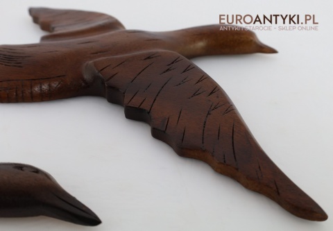 Każda z tych rzeźb jest starannie wykonana z drewna, z widocznymi detalami na skrzydłach i korpusach ptaków, co podkreśla ich autentyczność i rzemieślniczą jakość. Lite drewno użyte do produkcji nadaje im solidność i trwałość, a subtelne, naturalne wykończenie pięknie komponuje się z innymi antycznymi dekoracjami.