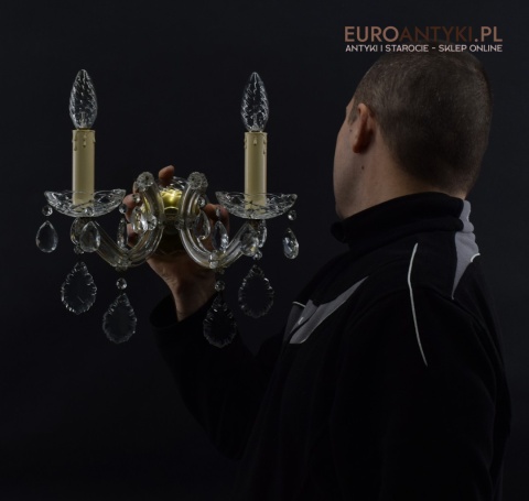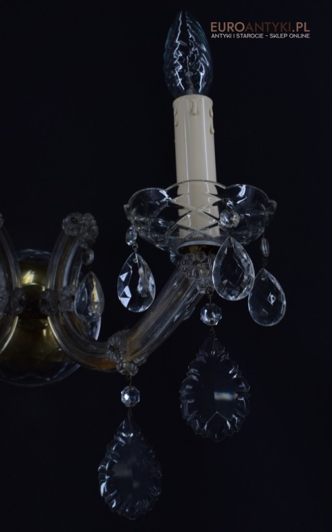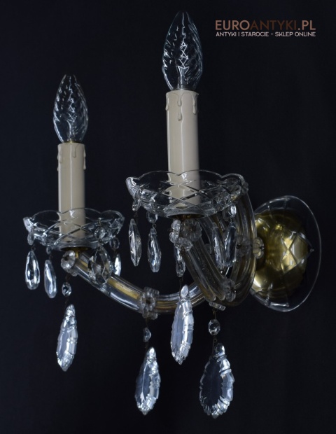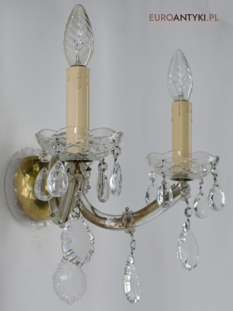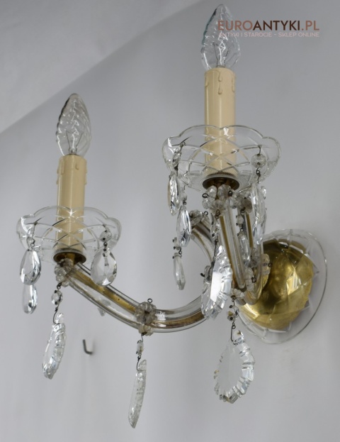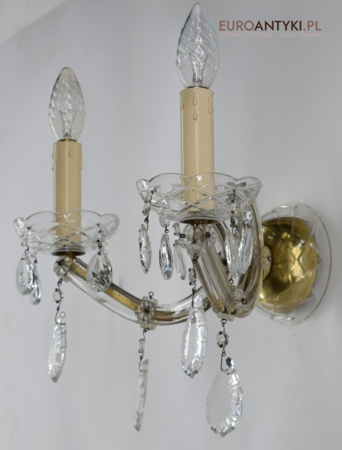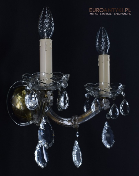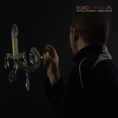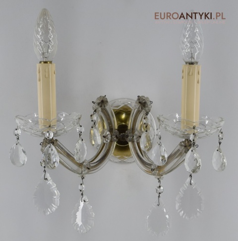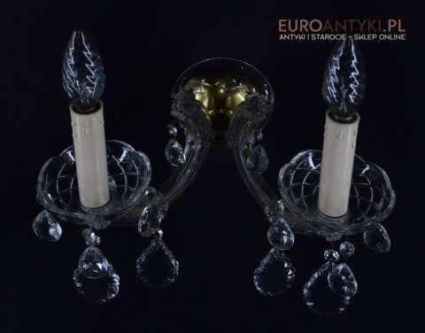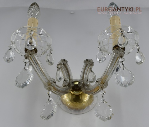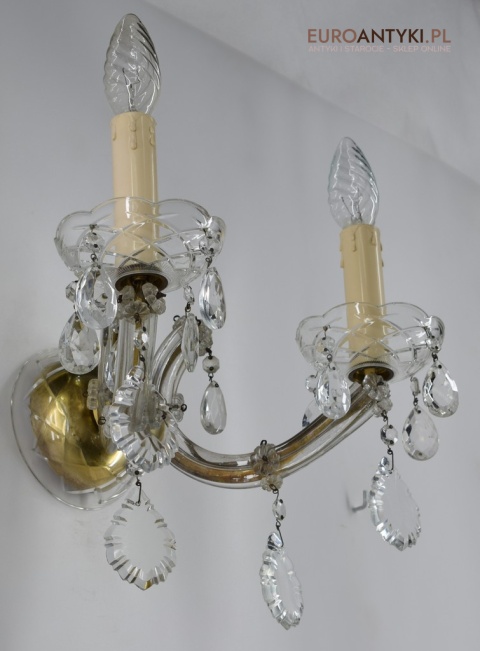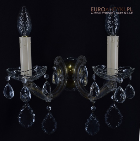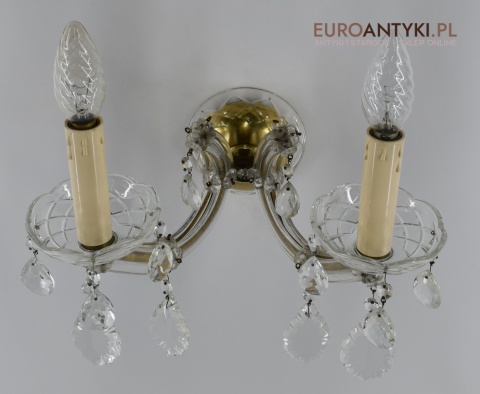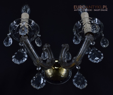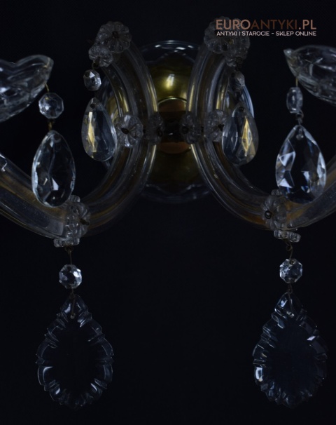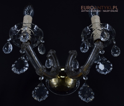 Stary kinkiet wykonany z mosiądzu, szkła i prawdziwych kryształowych zawieszek. Kryształy są wyjątkowo piękne i ślicznie mienią się gdy pada na nie światło, szkoda że zdjęcia nie ukazują tego pokazu iluminacji, bo naprawdę jest na co popatrzeć. Kryształy kompletne i w bardzo dobrym stanie. Nie poobijanie, nie klejone, nie pokruszone. 100% kompletne. Kryształowe talerzyki pod gilzami - średnica 10 cm.