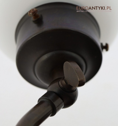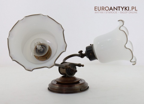 Prezentujemy unikatowy, używany kinkiet mosiężny z dwoma szklanymi kloszami w stylu florystycznym, które są w idealnym stanie. To wyjątkowe oświetlenie łączy klasyczny styl z funkcjonalnością, oferując możliwość regulacji światła dzięki ruchomym kloszom, które można ustawić w boki, w zależności od preferencji i aranżacji wnętrza. Kinkiet można zamontować kloszami do dołu lub do góry. Kinkiet sprowadzony z Francji - pochodzi z końca XX wieku. Z tyłu solidna zawieszka montażowa do szybkiej instalacji ściennej.