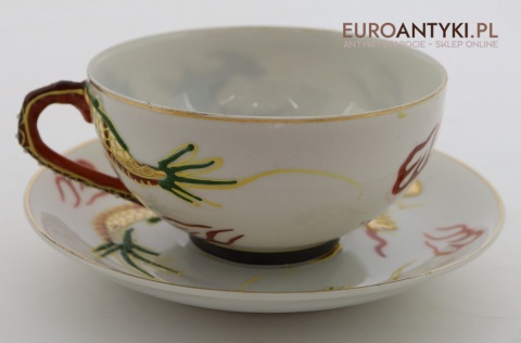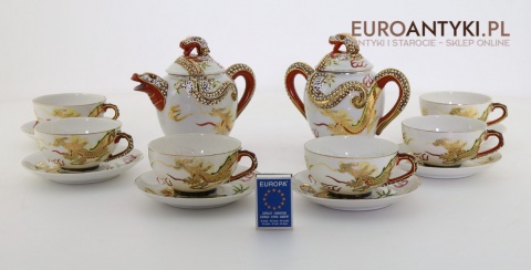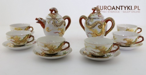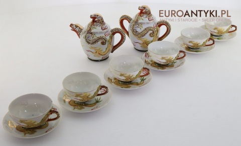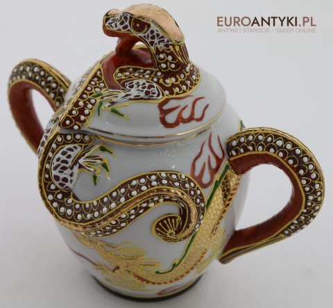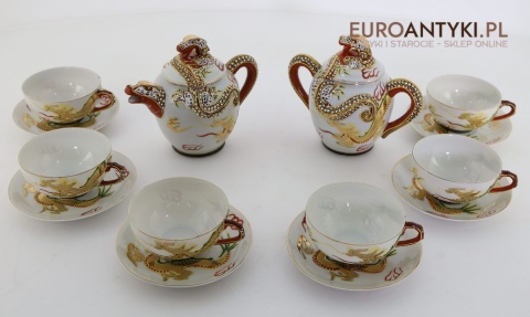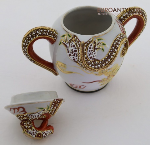 Przedstawiamy stary porcelanowy zestaw typu Dragonware, wyprodukowany w Japonii w latach 1920-1940 (okres Taisho lub wczesny Showa). Ten wyjątkowy serwis wykonany jest w charakterystycznym stylu orientalnym, zdobionym motywami złotych smoków oraz techniką wypukłego szkliwa (moriage).