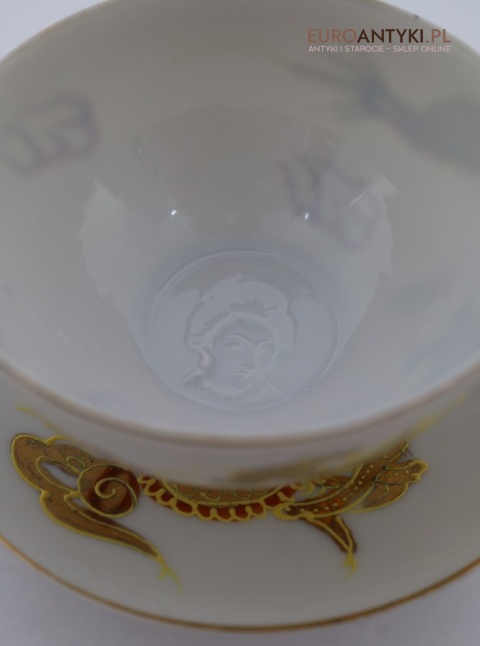 Co wyróżnia ten zestaw, to wytłoczony portret kobiety – Gejszy na dnie każdej filiżanki (technika lithophane). Podczas podświetlania filiżanki od spodu ukazuje się subtelna twarz kobiety, co jest typowe dla luksusowej porcelany tamtych czasów.