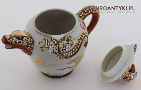 Dekoracje: ręcznie malowane złote smoki i reliefowe zdobienia techniką moriage