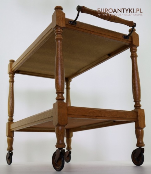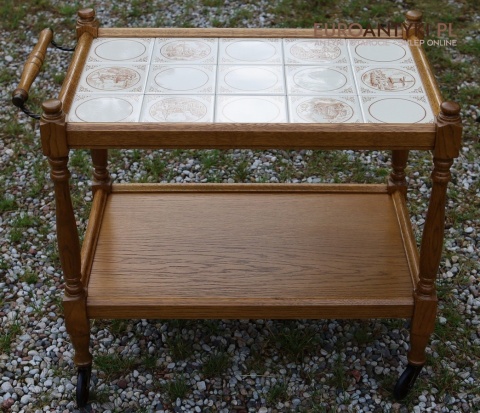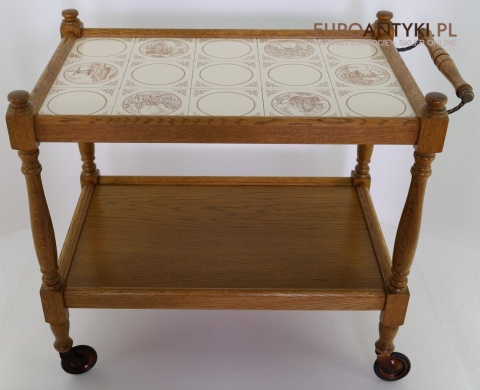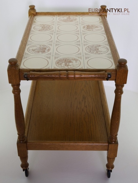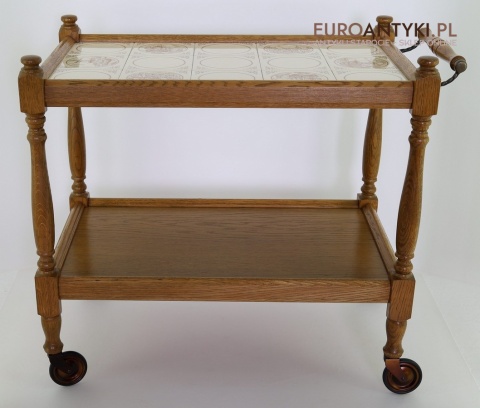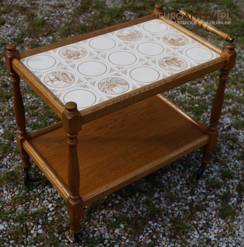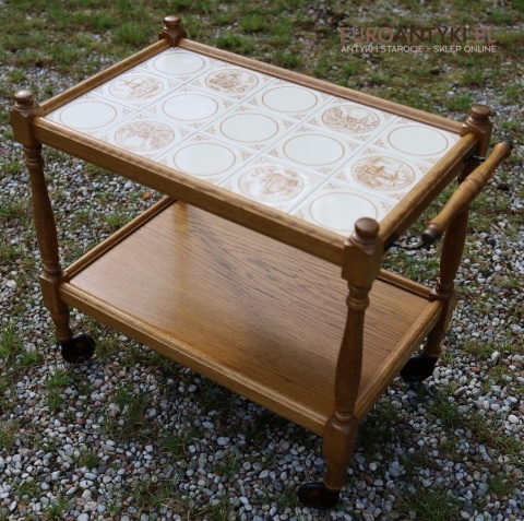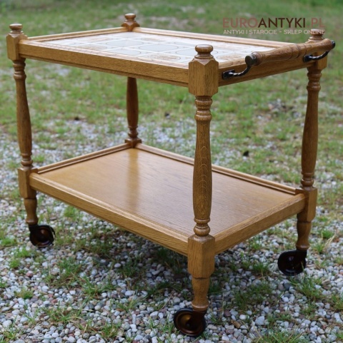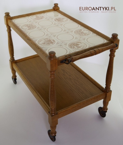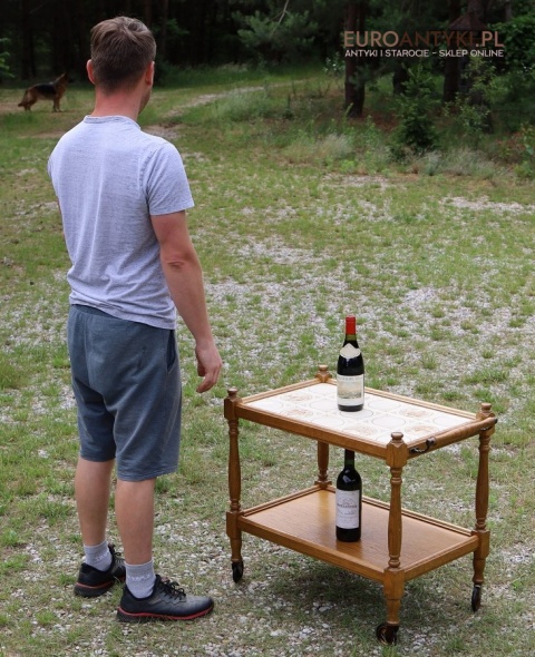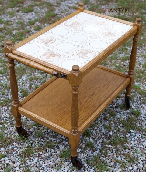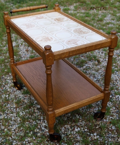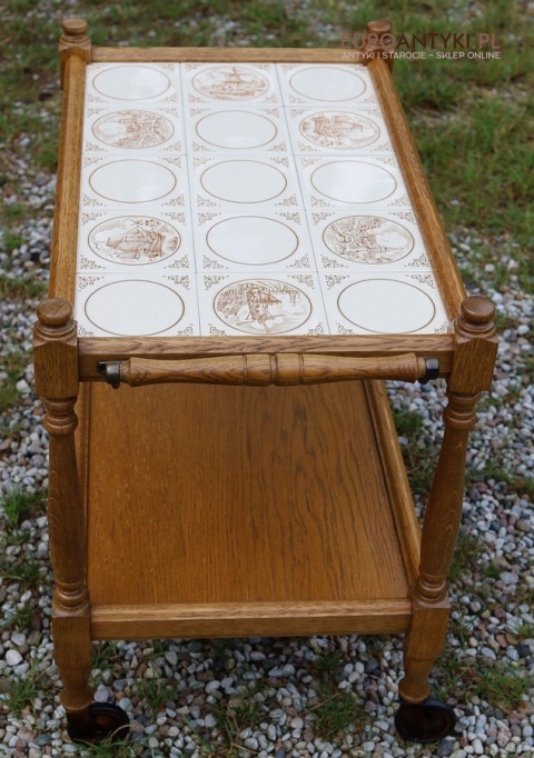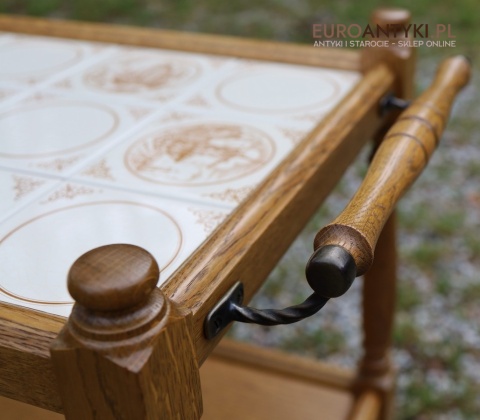 Oferujemy stary barek na kółkach, sprowadzony z Francji, wykonany z litego dębu, z pięknie zdobionym blatem z ceramicznych kafli w stylu rustykalnym. Rączka wykonana z kutego metalu oraz drewna – solidna i wygodna w prowadzeniu. Perfekcyjny stan techniczny i wizualny – nie rozklekotany, stabilny, czysty, bez śladów po drewnojadach czy nieprzyjemnych zapachów. Gotowy do użytku i prezentacji! 🌟