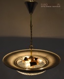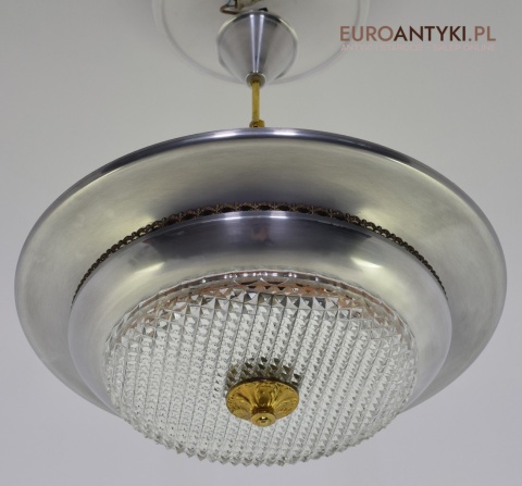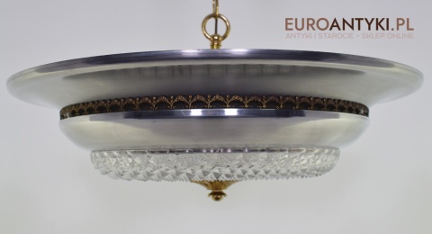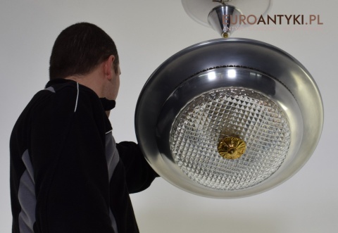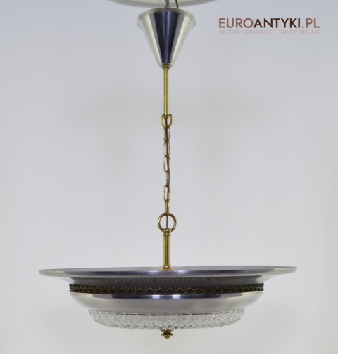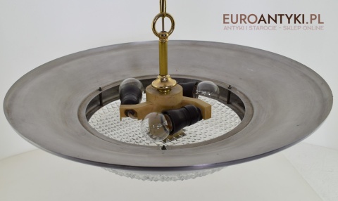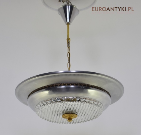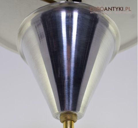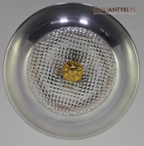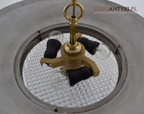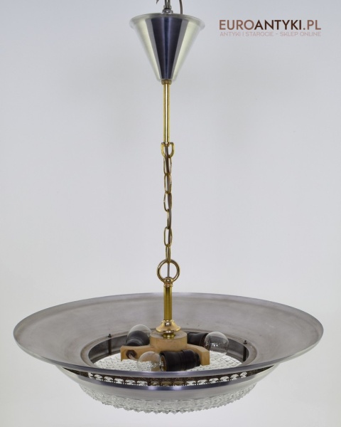 Sprowadzony z Austrii. Pochodzi z połowy ubiegłego wieku. Wykonany z masywnego aluminium i  mosiądzu. Masywny szklany klosz.