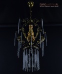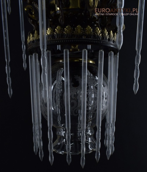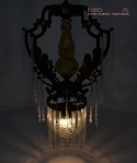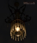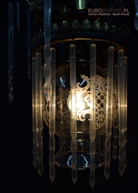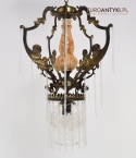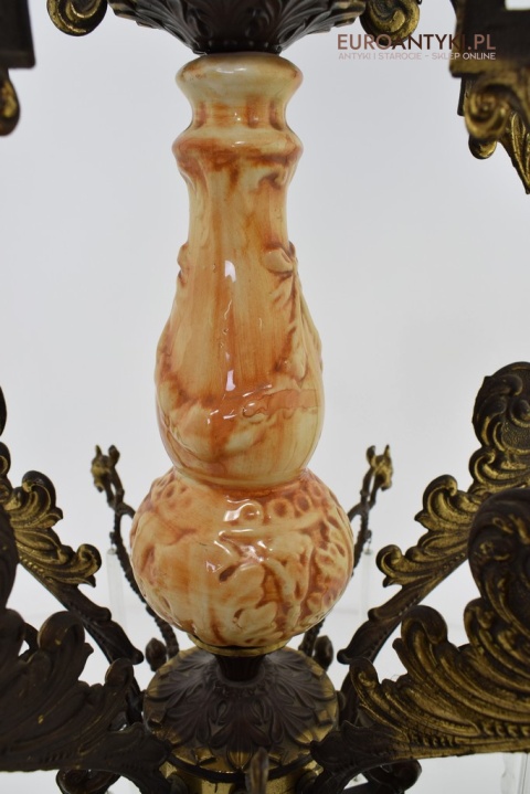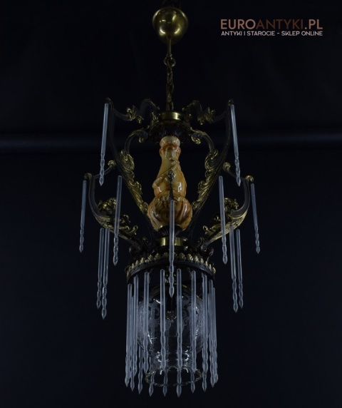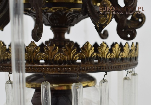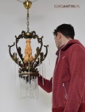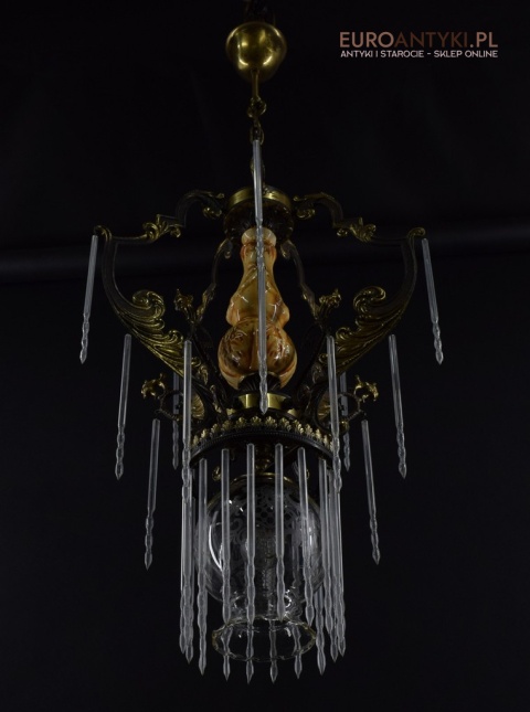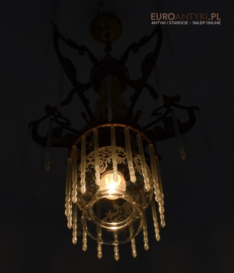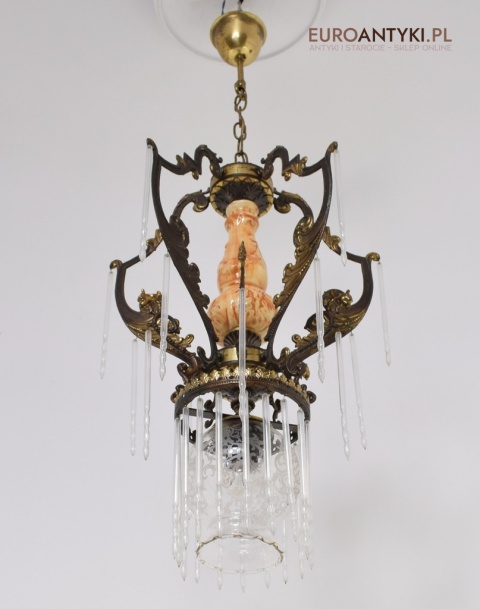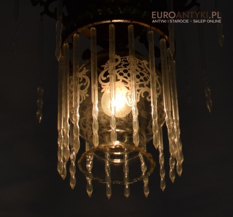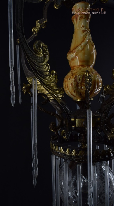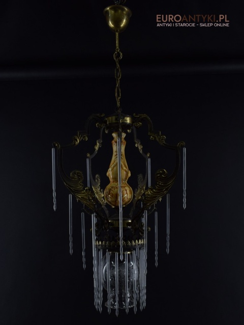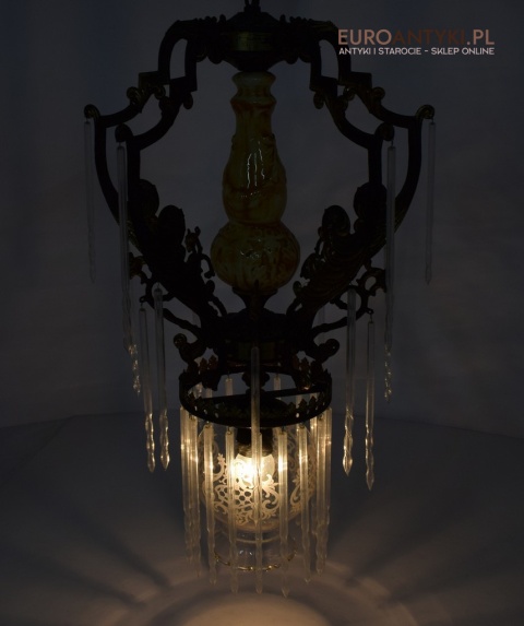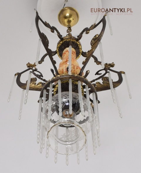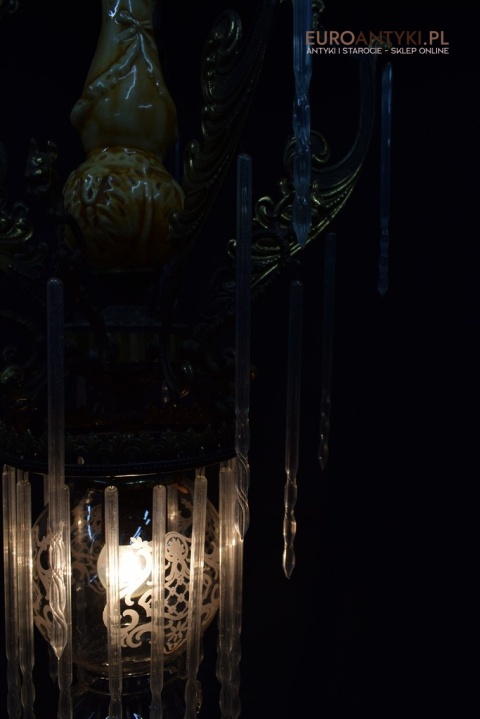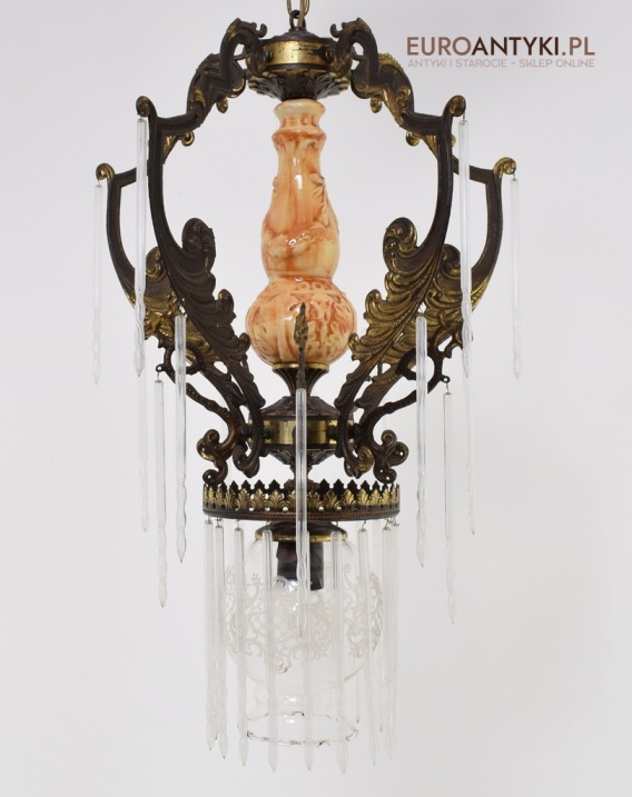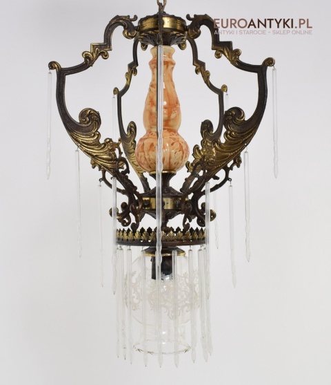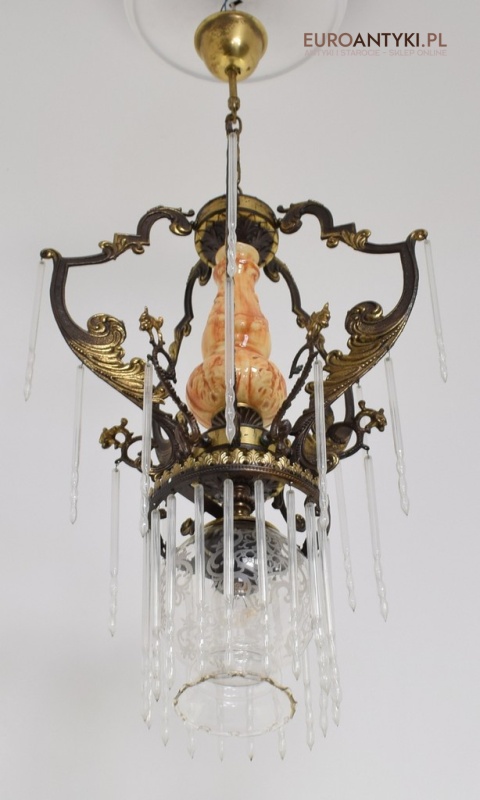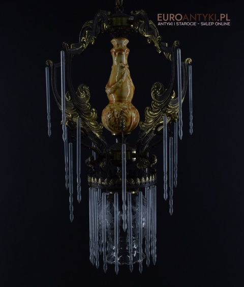 Sprowadzony z Paryża. Pochodzi z połowy ubiegłego wieku. Wykonany z masywnego mosiądzu, ceramiki + szklane wisiory w super stanie. Pod spodem jest szklany klosz.