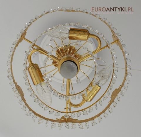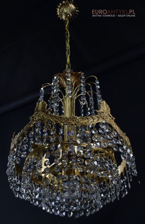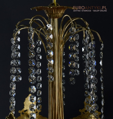 Sprowadzony z Austrii. Pochodzi z połowy ubiegłego wieku. Wykonany z masywnego mosiądzu + prawdziwe kryształowe zawieszki w stylu Swarovski. Kryształy są wyjątkowo piękne i ślicznie mienią się gdy pada na nie światło, szkoda że zdjęcia nie ukazują tego pokazu iluminacji, bo naprawdę jest na co popatrzeć. Kryształy kompletne i w bardzo dobrym stanie. Nie poobijanie, nie klejone, nie pokruszone. 100% kompletne.