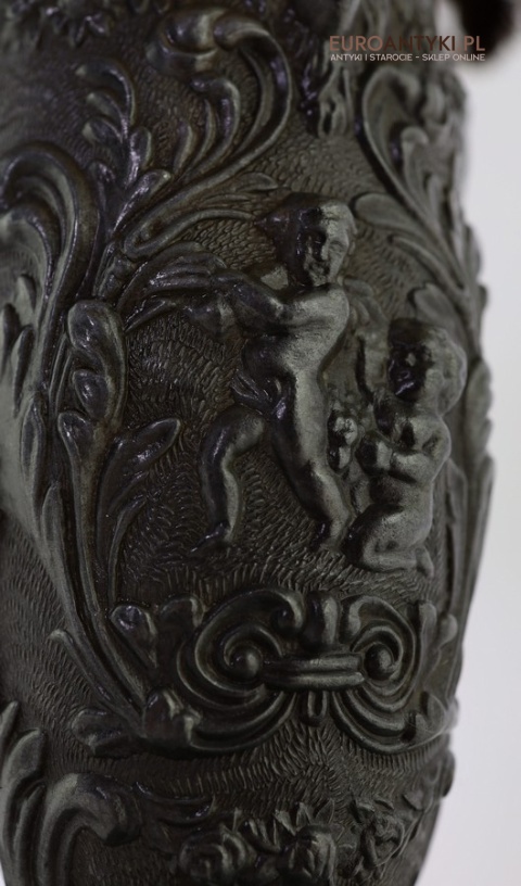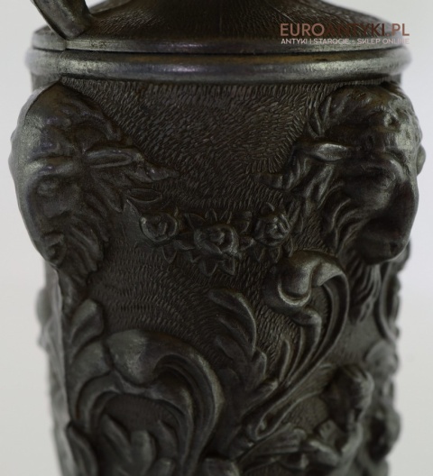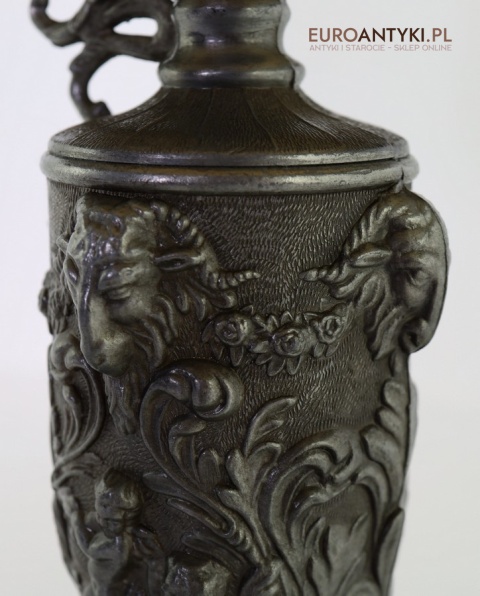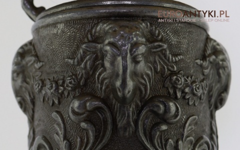 • Wykonanie: Odlewana cyna z bogatymi detalami – postacie, ornamenty roślinne, głowy kozłów