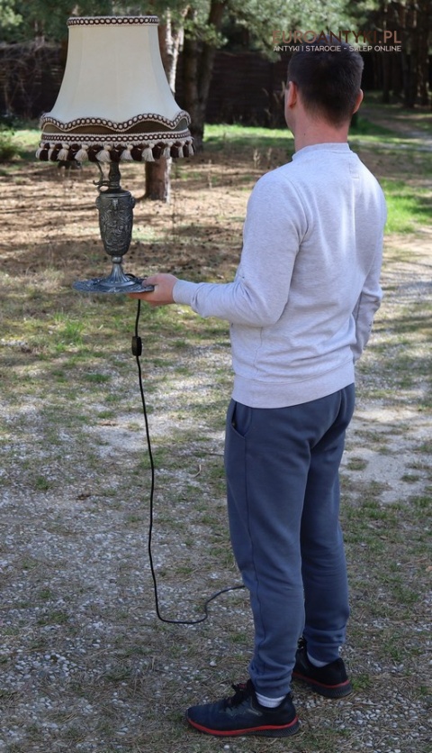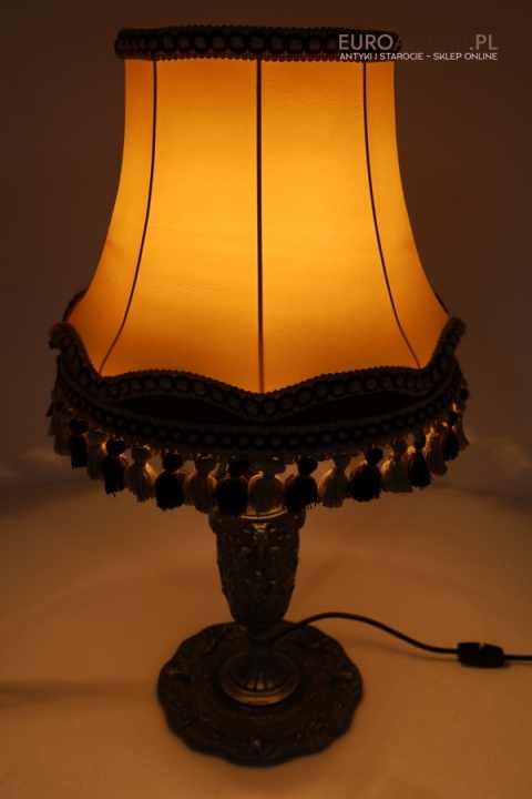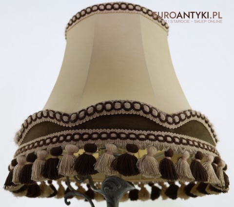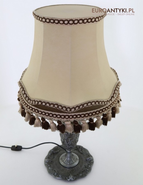 XL! Antyczna lampa stołowa z cynowym korpusem i abażurem z frędzlami – styl barokowy, lata 70. – Francja
