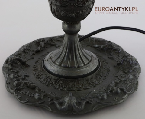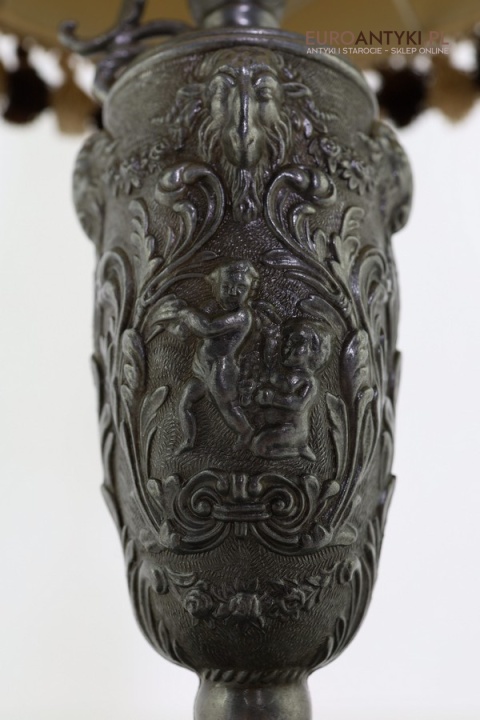 Przedstawiamy unikatową, starą lampkę stołową w stylu barokowym, wykonaną z ozdobnie odlewanej cyny, z efektownym tekstylnym abażurem ozdobionym frędzlami w odcieniach beżu i brązu. Trzon lampy dekorowany jest pełnoplastycznymi motywami – wśród ornamentów roślinnych wyróżniają się figury puttów oraz wizerunki głów kozłów, co doskonale wpisuje się w bogaty język barokowego zdobnictwa.
