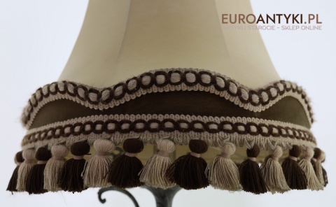 • Materiał: Korpus z cyny 90%, tekstylny abażur z ozdobnymi frędzlami