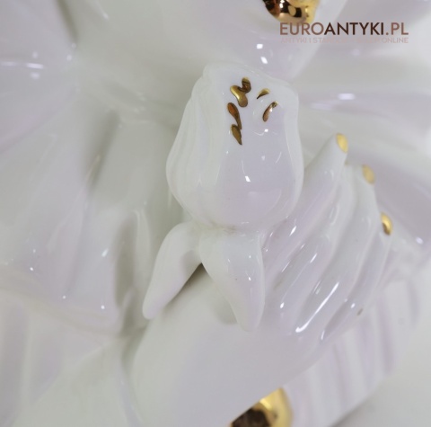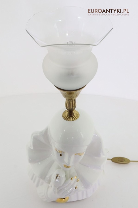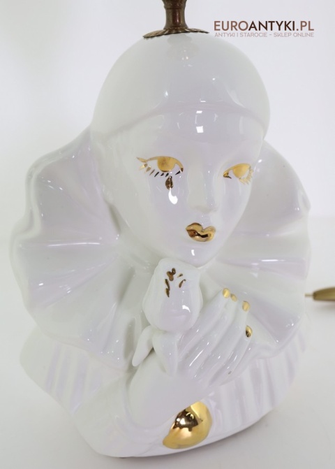 Oryginalna ceramiczna lampa z motywem Pierrota, trzymającego ptaszka – symbol niewinności i wrażliwości. Złocone detale na twarzy, ustach i paznokciach nadają całości teatralnego blasku. Szklany klosz w kształcie rozchylonego kwiatu dodaje elegancji i lekkości. Nowa elektryka oraz przewód sprawiają, że lampa jest gotowa do natychmiastowego użytku.