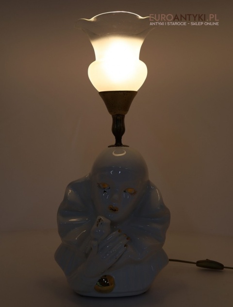 Lampa utrzymana jest w niezwykle dekoracyjnym stylu vintage z lat 50.–60. XX wieku. Ukazuje postać Pierrota – romantycznego błazna, znanego z włoskiej i francuskiej tradycji teatralnej. Styl ten łączy elementy nostalgii, emocji i artyzmu, doskonale wpisując się w aranżacje wnętrz w duchu retro, art déco i boho romantycznym. Tego typu dekoracje były modne w Europie Zachodniej i USA, dziś wracają do łask jako wyraz osobistego, nastrojowego designu.